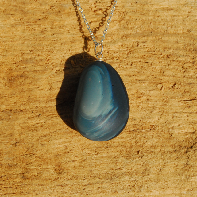 Galaxy glass is not transparent but has beautiful stripes. It was a waste product of glass factories and is found mainly in grey and blue tones. This tumbled piece is beautifully three-dimensional as it is very thick. The colours are lovely shades of blue-grey at the front and nearly black at the back.