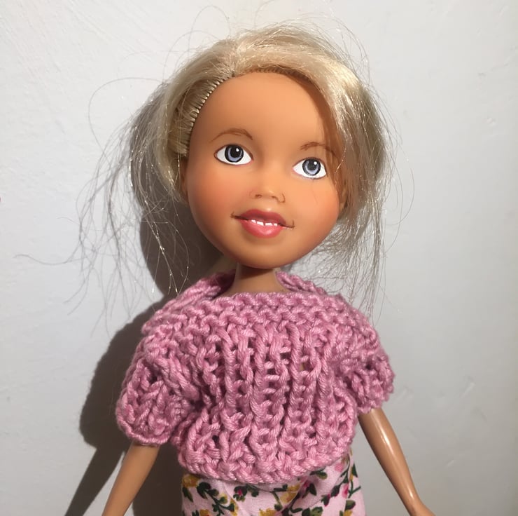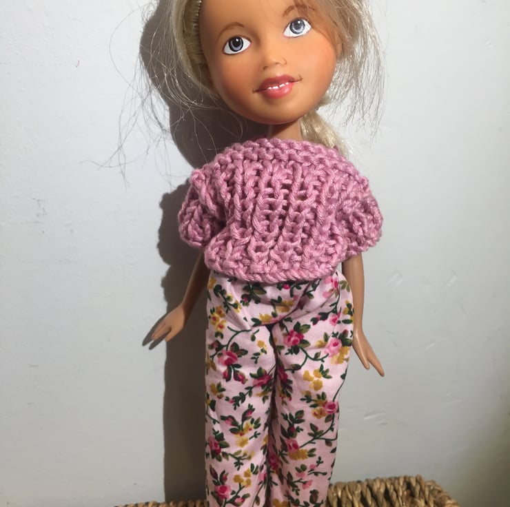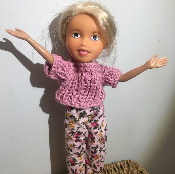 Sally has beautiful blue eyes and mid length blonde hair. She has enjoyed a thorough spa treatment and has had her hair detangled, washed and trimmed. She has been cleaned and sterilised. Her face has been repainted by hand and sealed to give her a fresh, natural look. Sally has a cute outfiit including a hand knitted cotton yarn pullover and a matching floral trousers . She has pop on and off hand sculpted shoes made from silicone.
