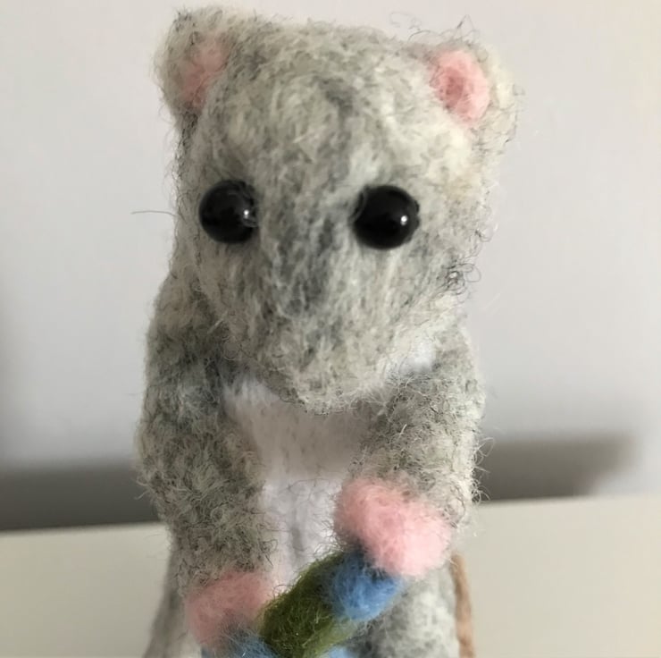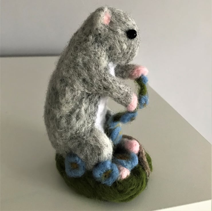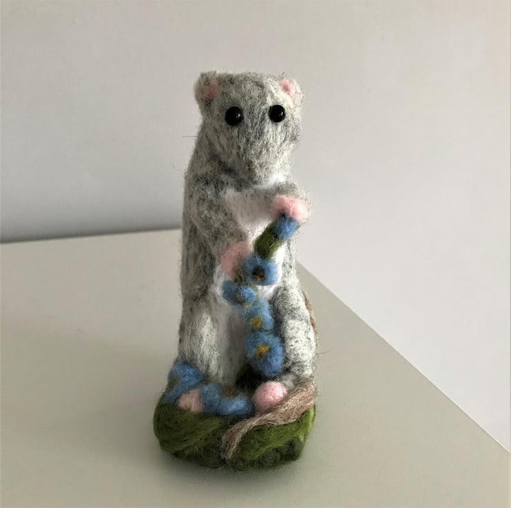 A forget-me-not garland is held in this little mouse's paw . Needle felted 13 cm high including base, with bead eyes .