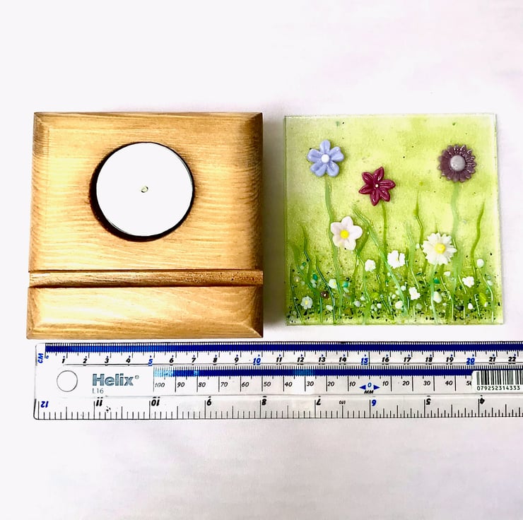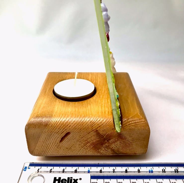 It is then slotted into a handmade wooden stand crafted from redwood and polished to a smooth finish. It has a hole deep enough for a tealight candle to light up the scene. The stand itself measures approximately 10cm square and 4cm high. This piece has been made by my Dad in his workshop.