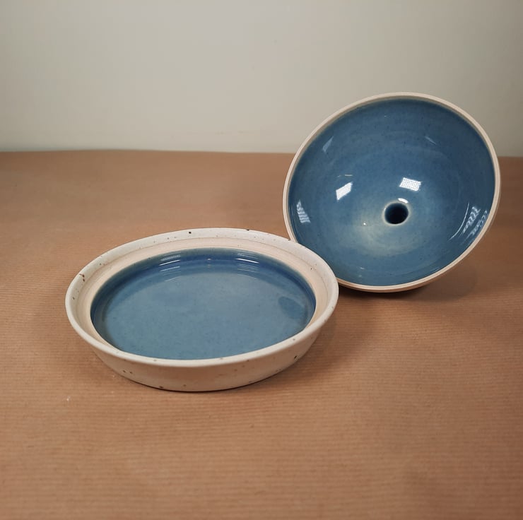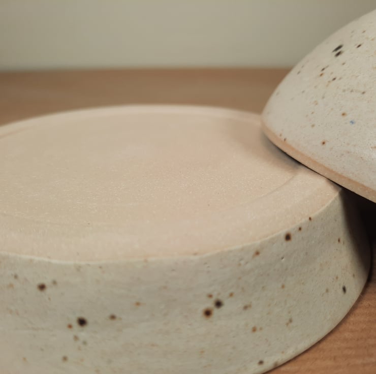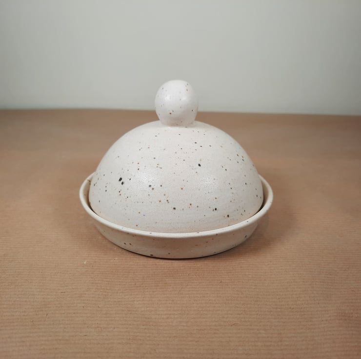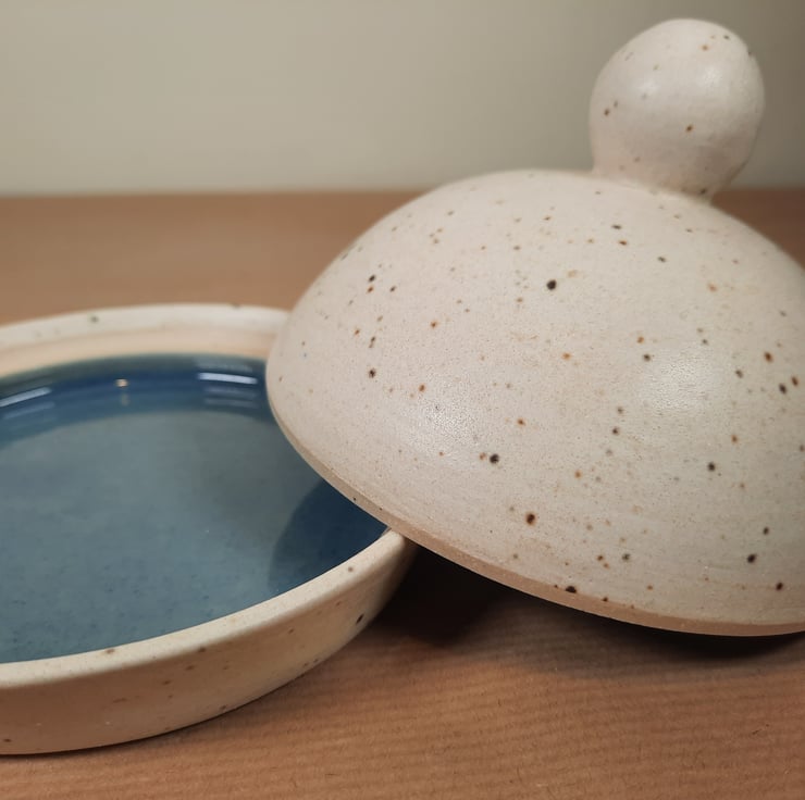 The butter dish has a glossy blue grey interior of base and lid and a matt cream speckle exterior of base and lid. Being made from high fired stoneware clay, it is robust enough for daily use.