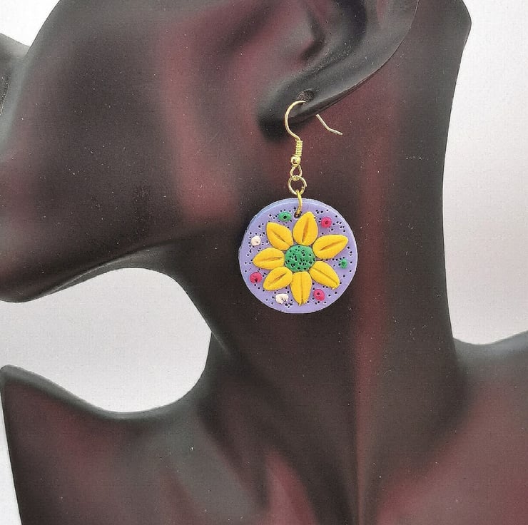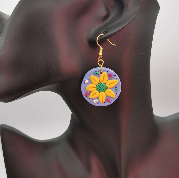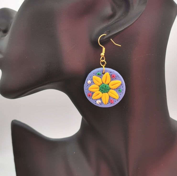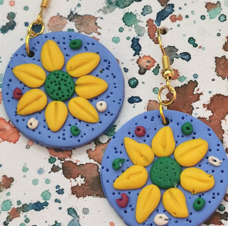 Handcrafted, polymer clay, yellow flower disc earrings.