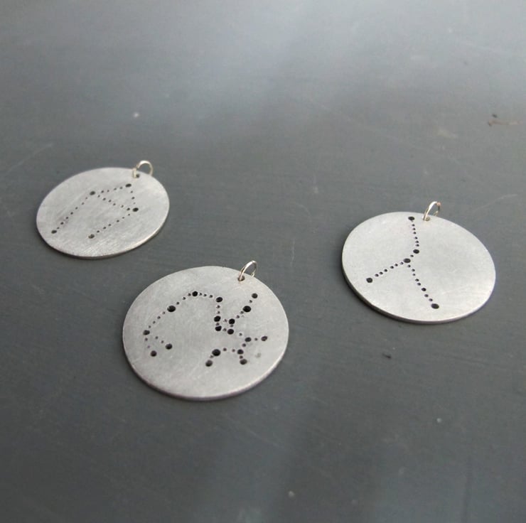 Personlised star sign charm with your choice of zodiac star constellation. Each charm features the star signs the astrological constellation from the nights sky. Each star is drilled and highlighted on a circular aluminium charm.