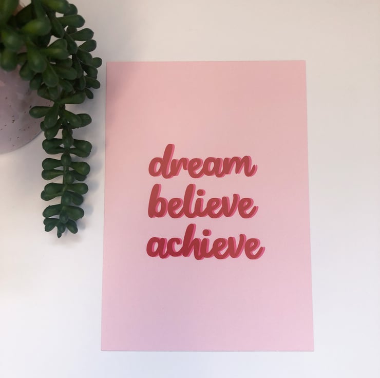 This is an A6 / postcard size colourful print with a matte finish on 360gsm card featuring the words Dream Believe Achieve.