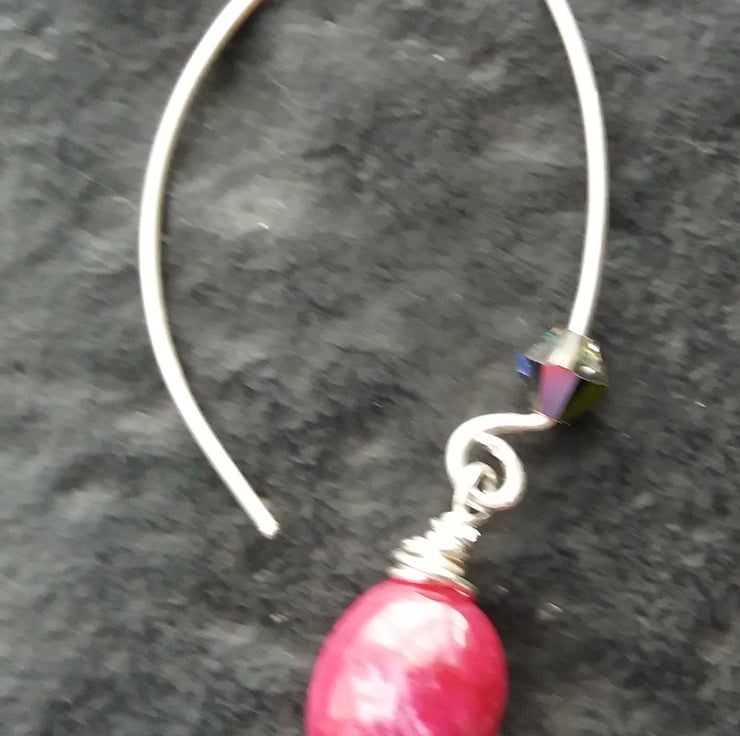 Pretty ruby oval beads hanging from handmade sterling silver ear wires with swarovski beads for extra sparkle.