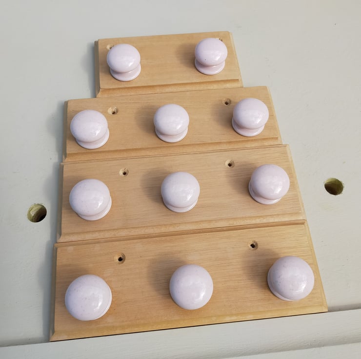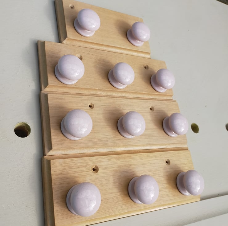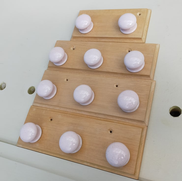 Another charity shop find: pink ceramic drawer knobs mounted on waxed beech, with two countersunk screw holes. Probably best for necklaces or towels, but maybe also dressing gowns if the loop is big enough. L 255mm x H 90mm x D 45mm. Two-knob panel is L 180mm.