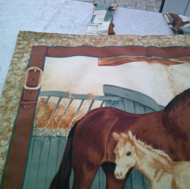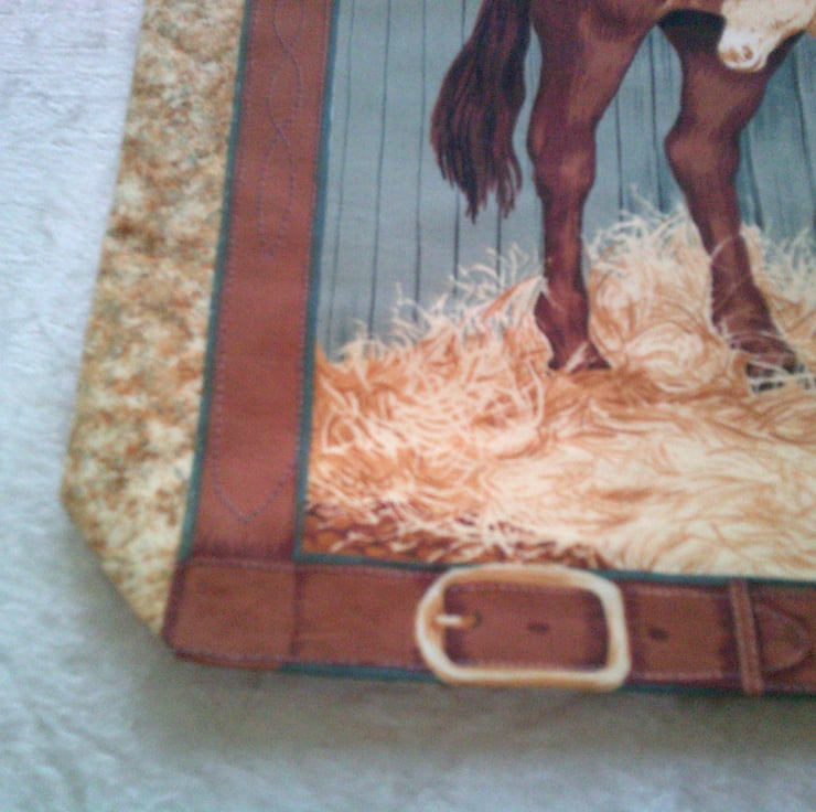 This Eco Friendly, fabric bag is made using 100% Cotton panels with pictures of a mare and her foal in a stable setting in a square made up from belts and edged with a mottled beige surround. Both sides of the bag are the same.