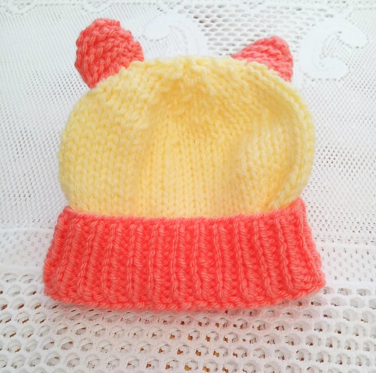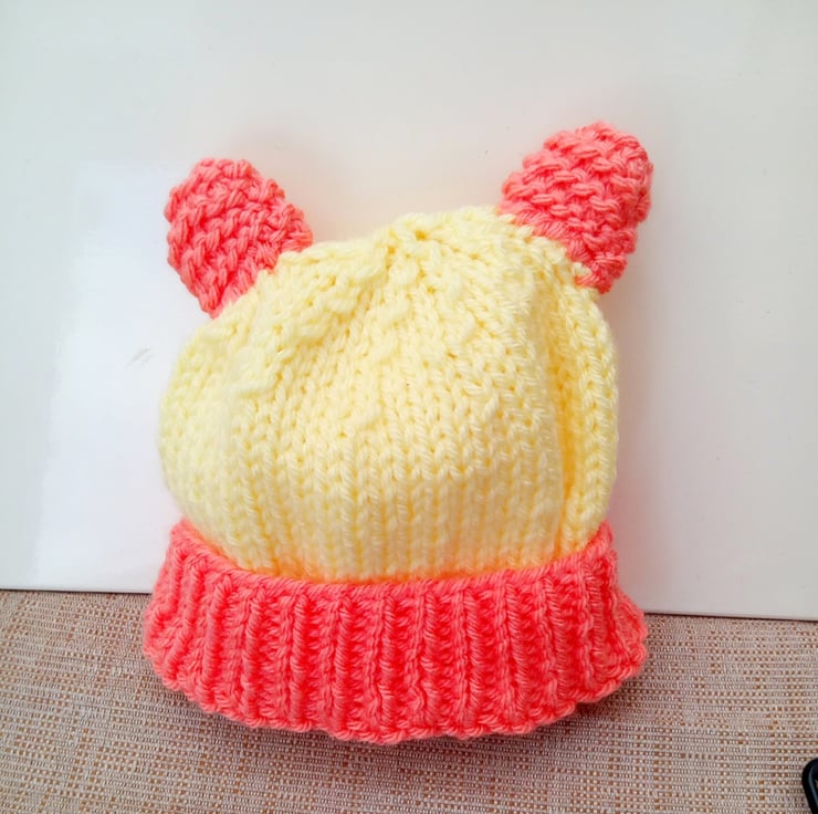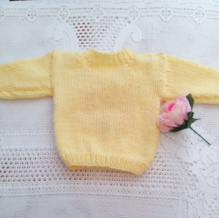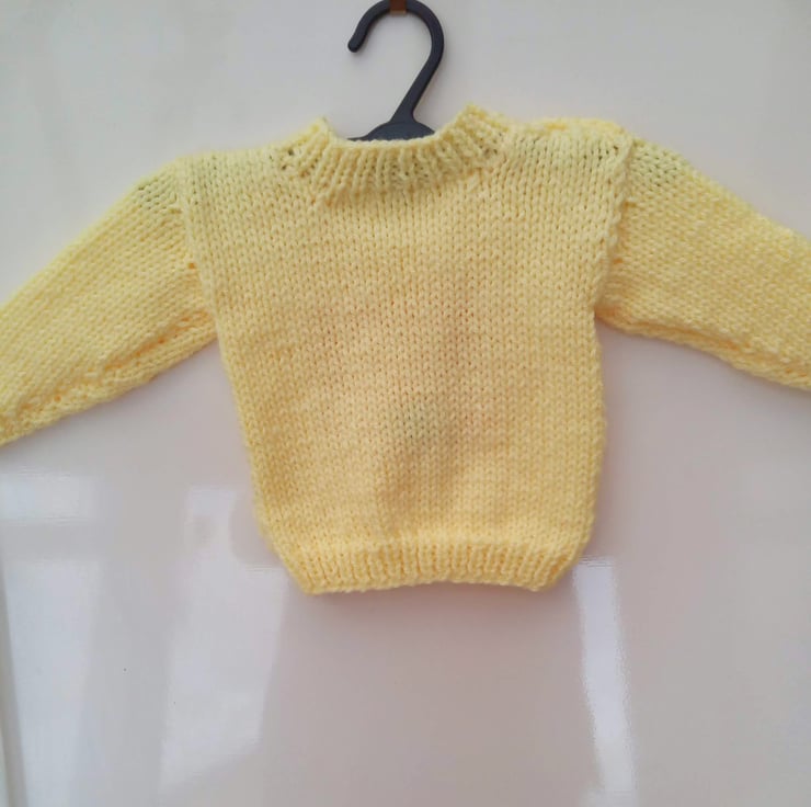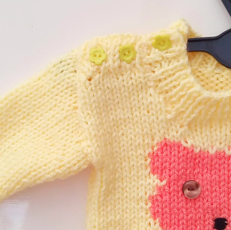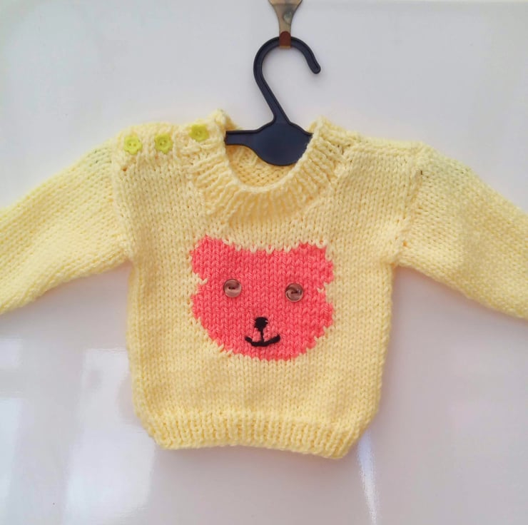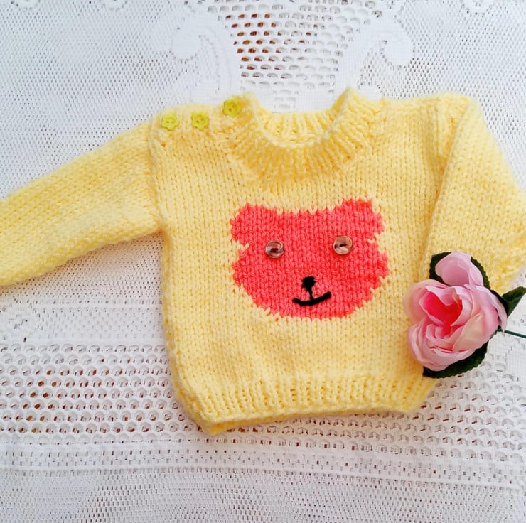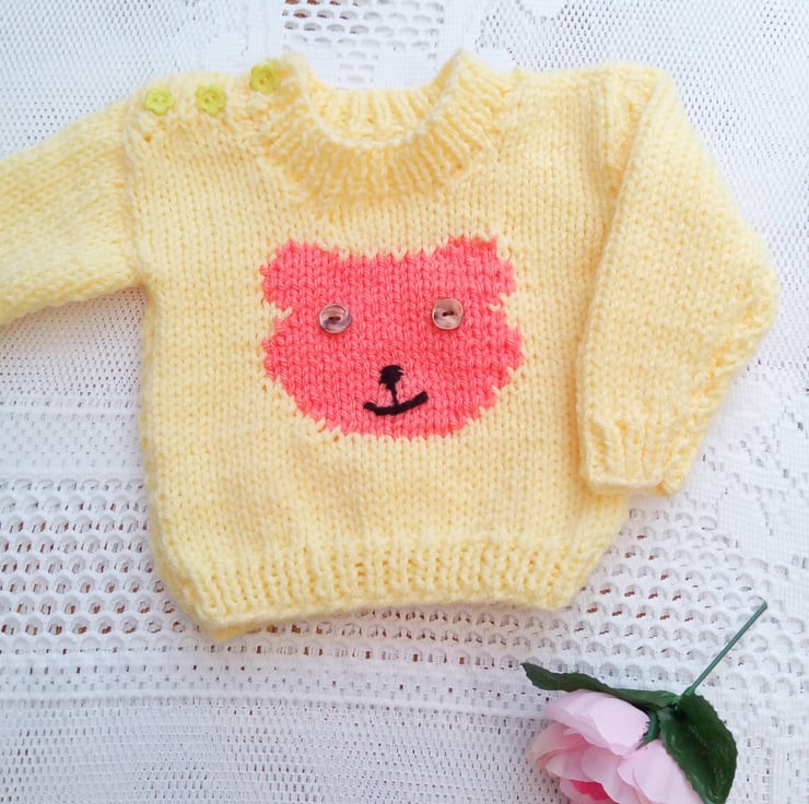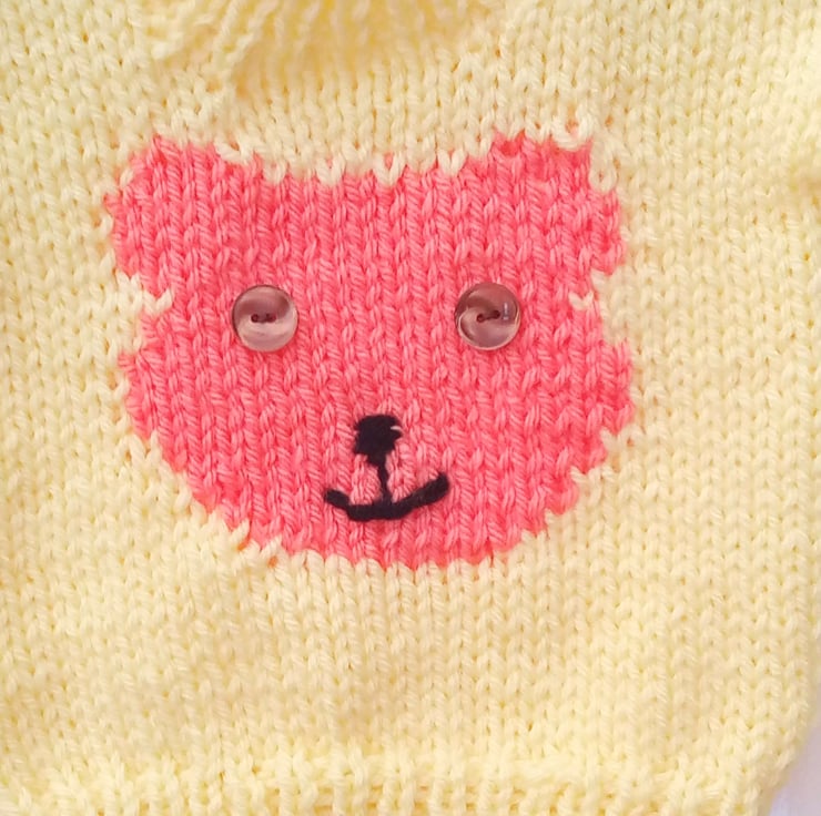 A really cute hand knitted round neck chunky knit jumper, with a teddy bear motif, and matching hat for children up to 3 years made using chunky yarn to give the set extra thickness to make it warm for chilly days. It is in stock in the lemon with a peach teddy and trimmings on the hat. It can also be made for you in a size and colour(s) of your choice. Please see below for the available sizes and prices and state the colour required when you order. Please allow approximately 2 weeks processing time for the jumper to be made and posted to you.