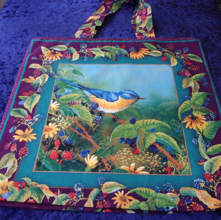 This Eco Friendly, fabric bag is made using 100% Cotton panels with pictures of birds on blackberries each side surrounded with a deep magenta border. .