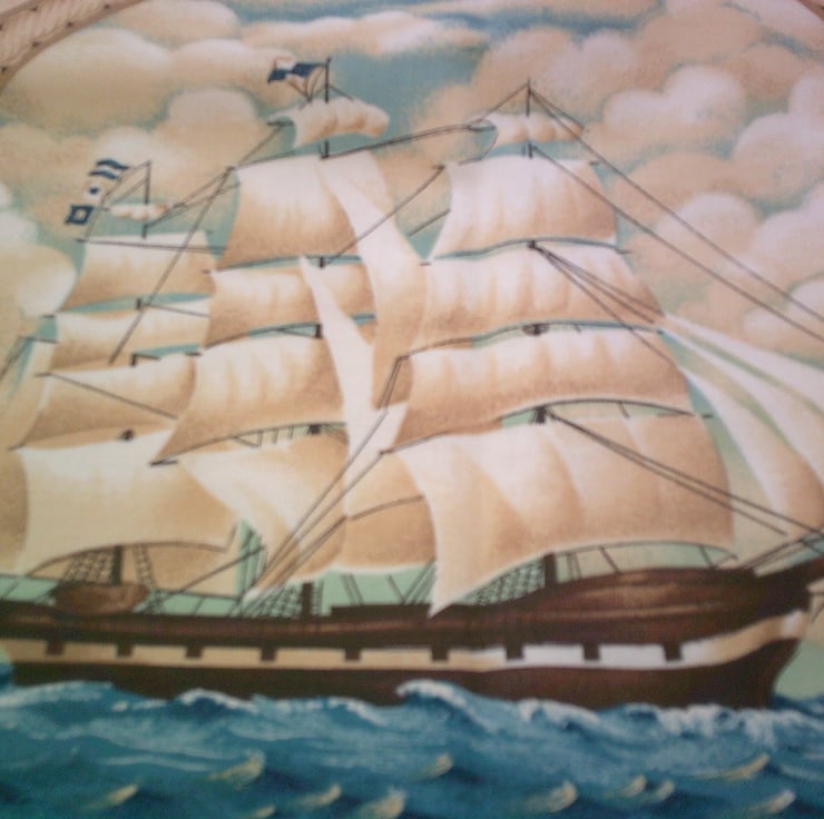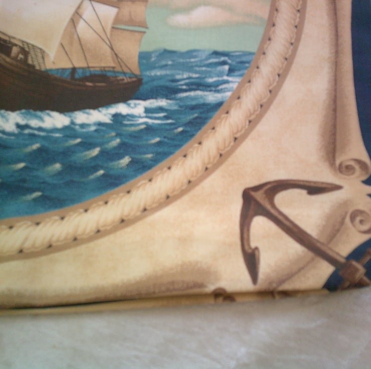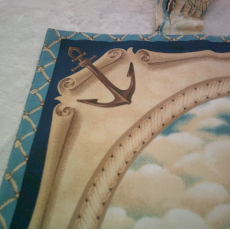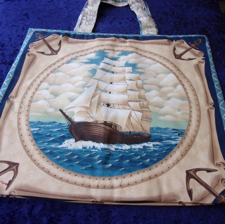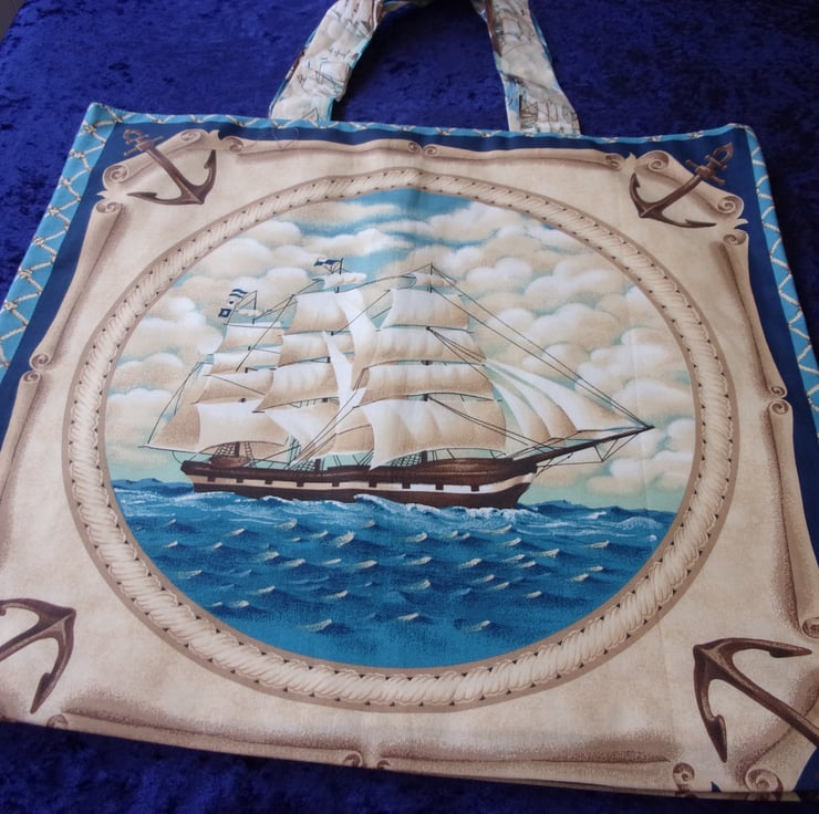 This Eco Friendly, fabric bag is made using 100% Cotton panels with pictures of Clipper Ships in full sail racing across the ocean. The border consists of a Parchment square with anchors in the corners and surrounded by a dark blue border.