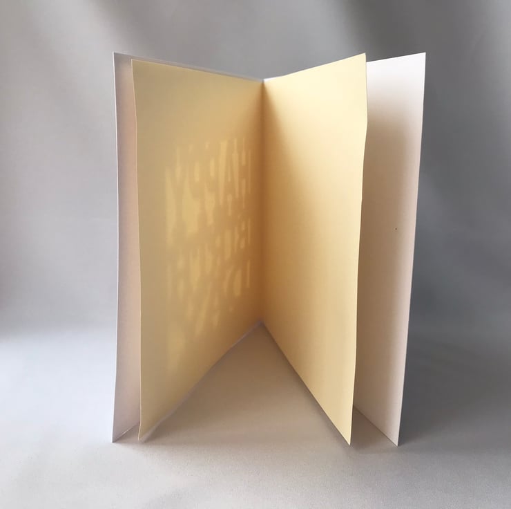 The card has happy birthday cut out on the front of the card with a blank inside to write your loving message. On the back of the card is a sticker saying handmade and designed by Kind Crafts.