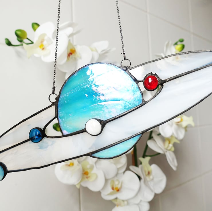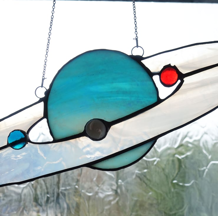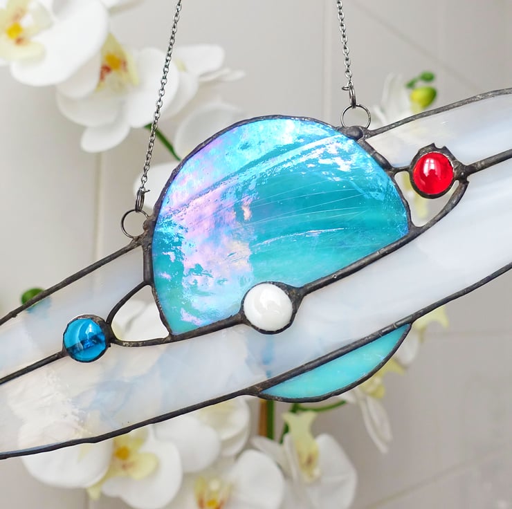 Lovely blue Saturn window ornament made from iridescent blue glass and streaky clear and white glass for the rings with coloured jewels for the moons. Great for Sci Fi Fans and lovers of the Universe and Solar System. The patina on the solder is antique copper which gives a nice gleam under certain lighting.