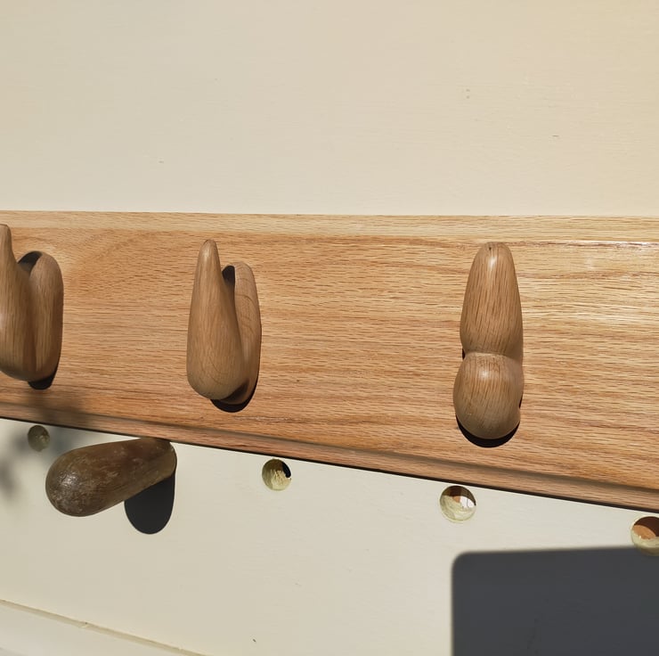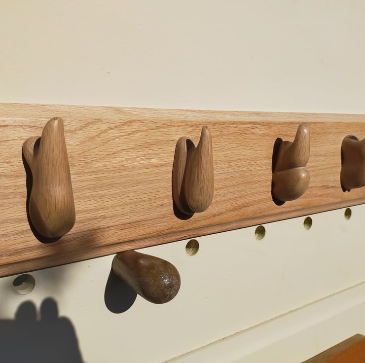 Quite simply the most unusual item ypu will find, this coat rack is inspired by the natural shapes of the garden, but is it a piece of furniture or a piece of art? Each incredibly tactile hook, hand carved and polished over many hours from reclaimed oak, is completely different and absolutely unique, serving as as a hook for your coat and as a mini sculpture in its own right. The five abstract shapes have been glued and screwed to a piece of reclaimed oak library shelf and given a clear wax polish. L 760mm x H 145mm x D 70mm.
