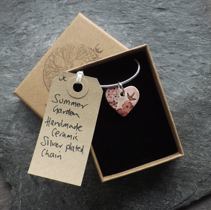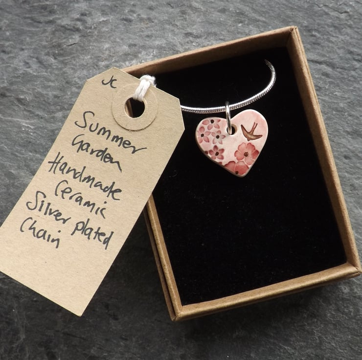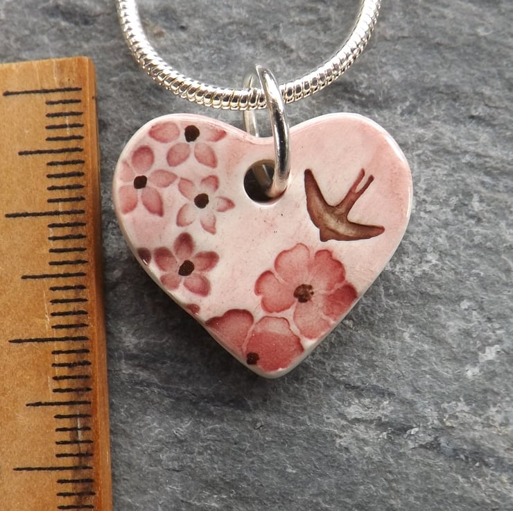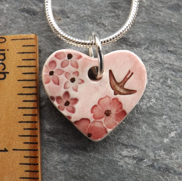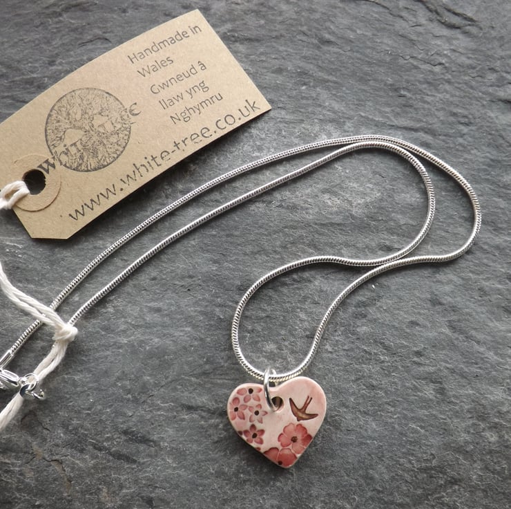 This dainty heart pendant has flowers and a swallow stamped into the wet clay, and is painted in shades of pink and lilac. As with all my jewellery it is made and decorated entirely by hand.