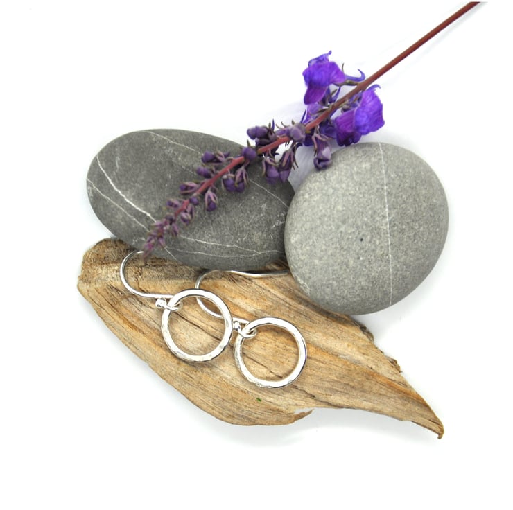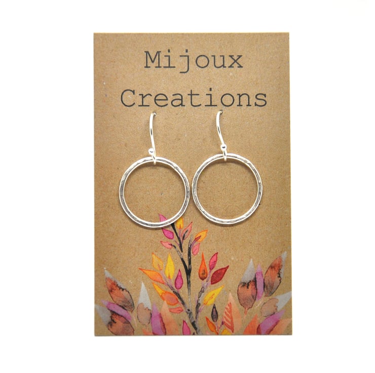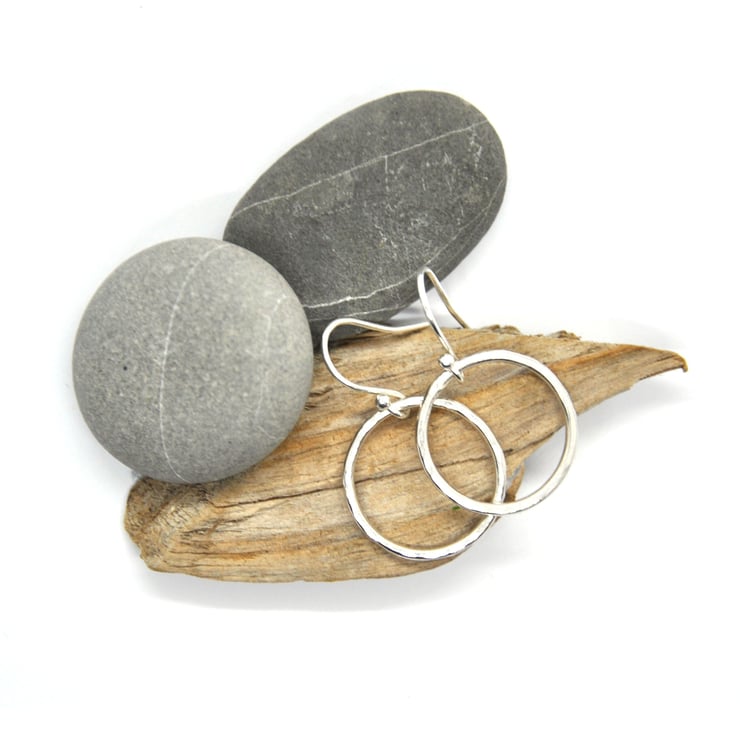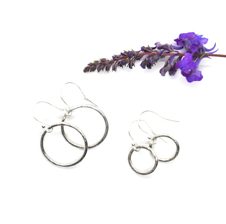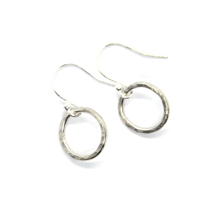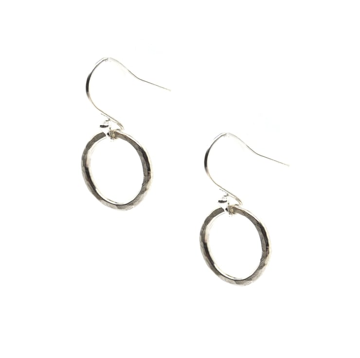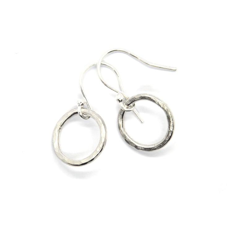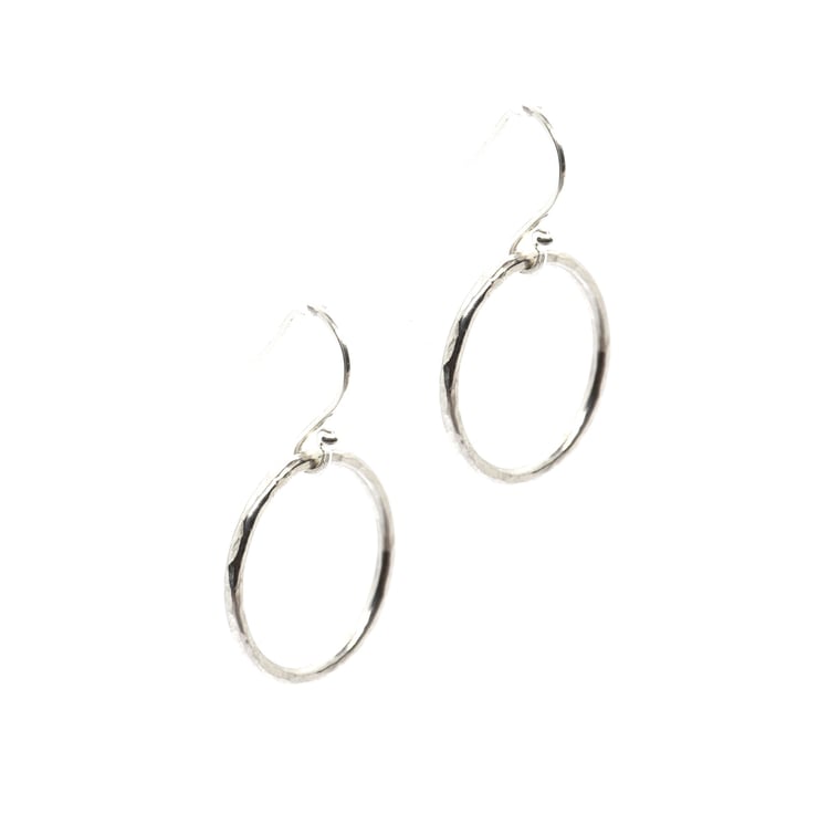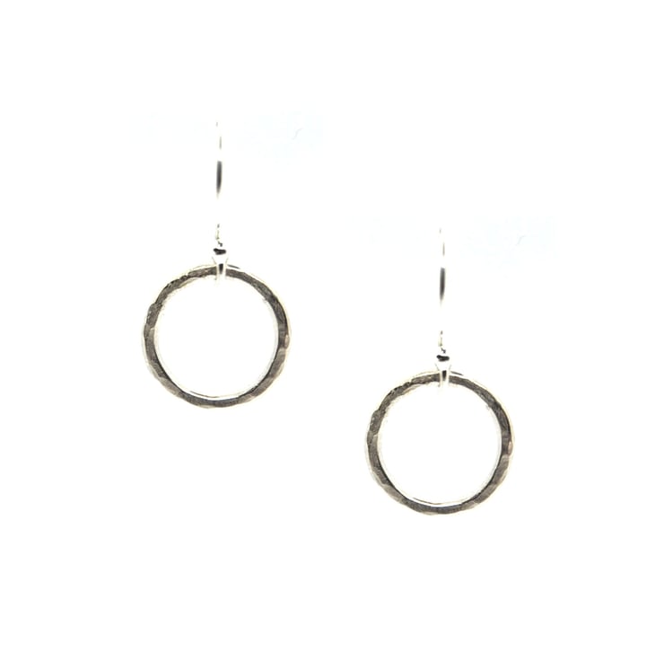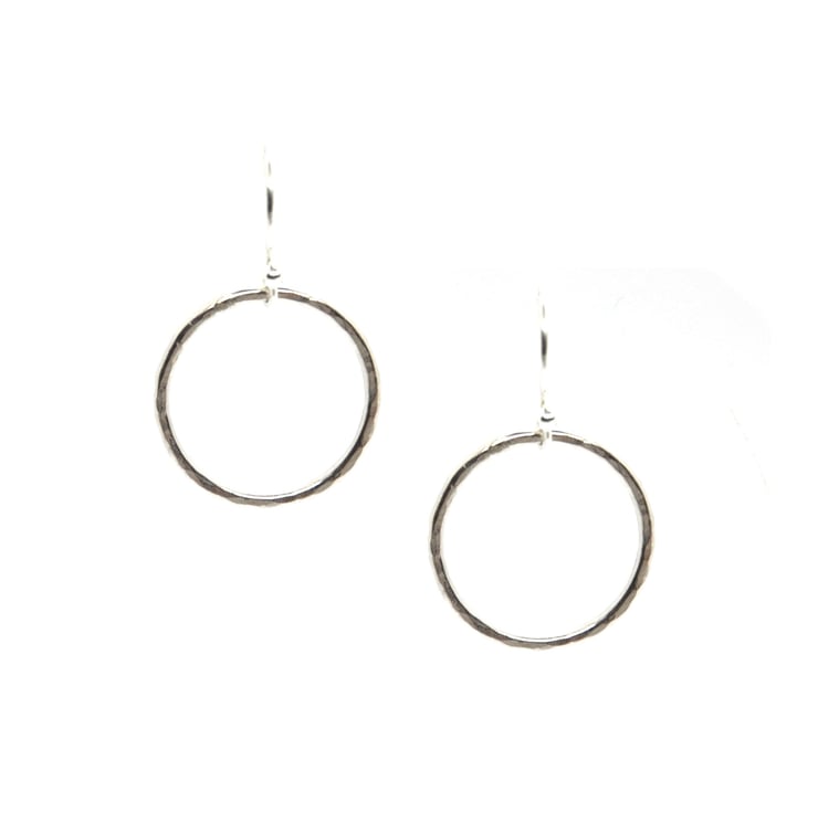 A solid silver circle is suspended from a delicate ear wire. The circles have a hammered finish which catches the light when worn.