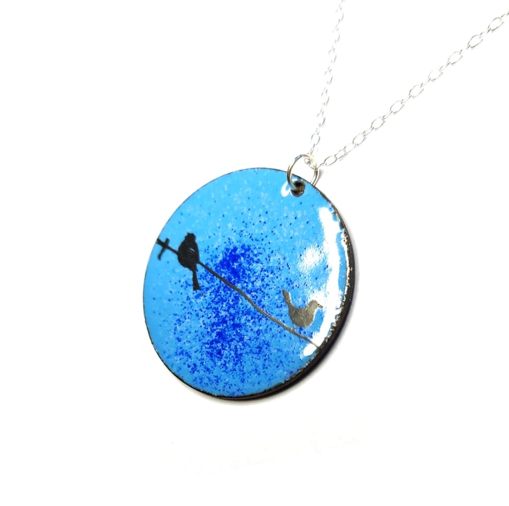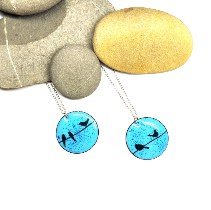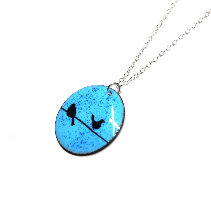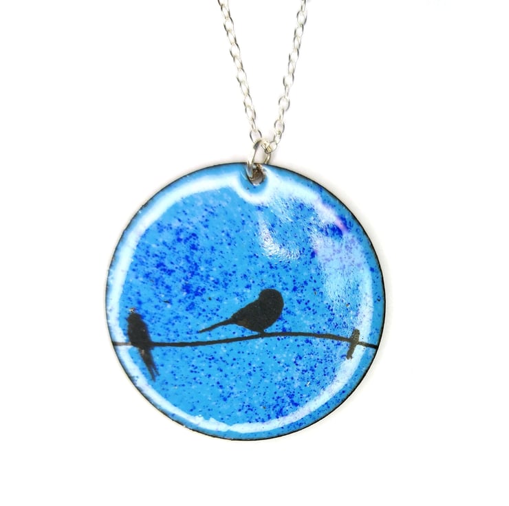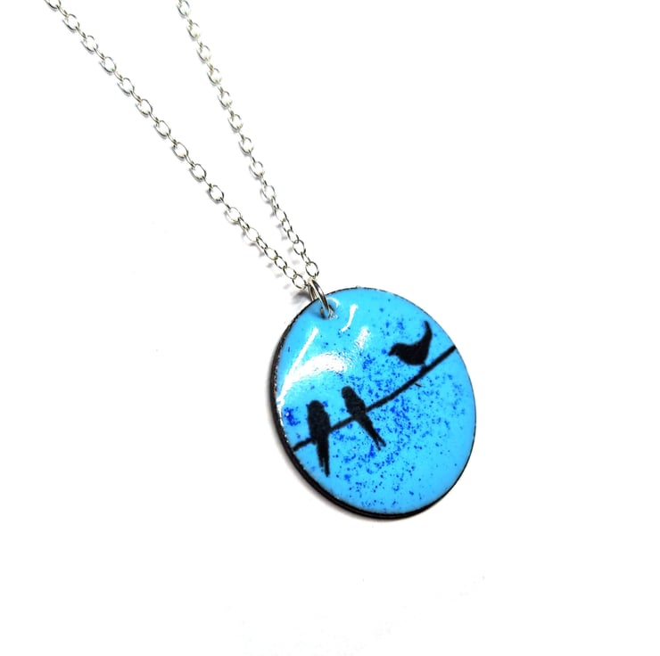 This beautiful pendant is crafted with blue vitreous enamels and features sweet little birds perched on a wire. Perfect for any nature lover.