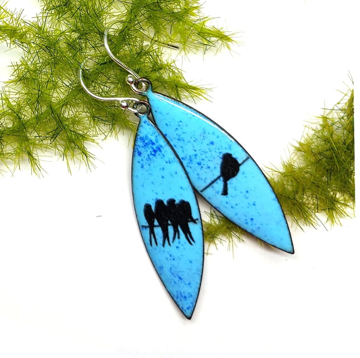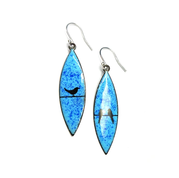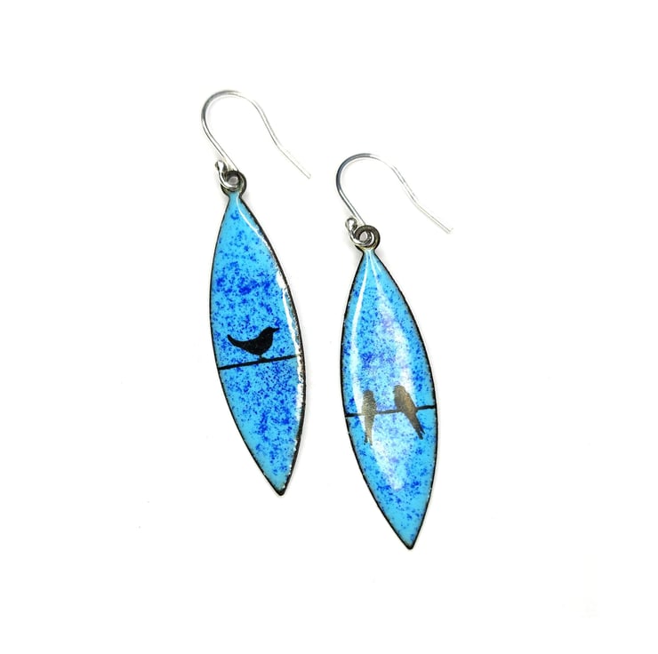 These beautiful drop earrings are crafted with blue enamels and feature sweet little birds perched on a wire. Perfect for any nature lover.