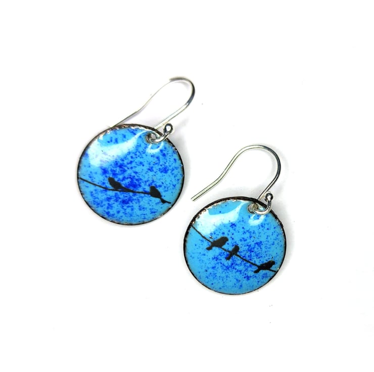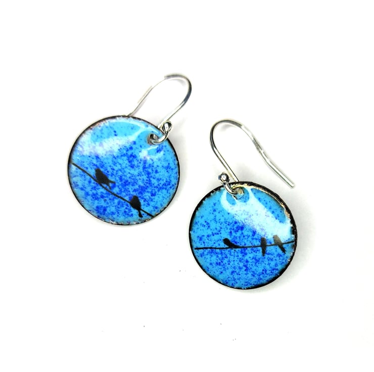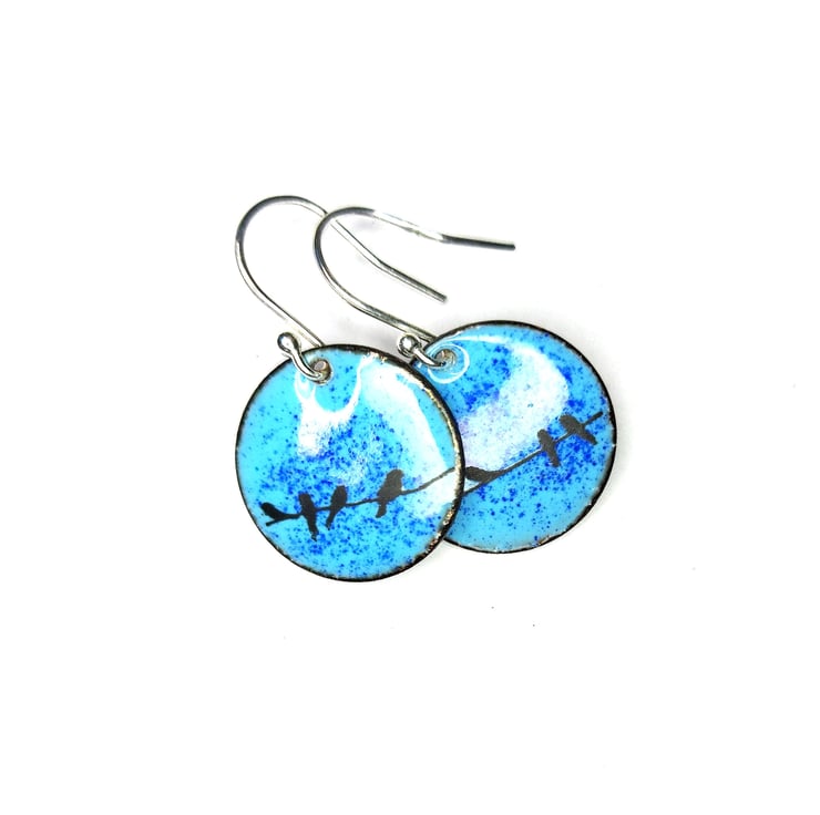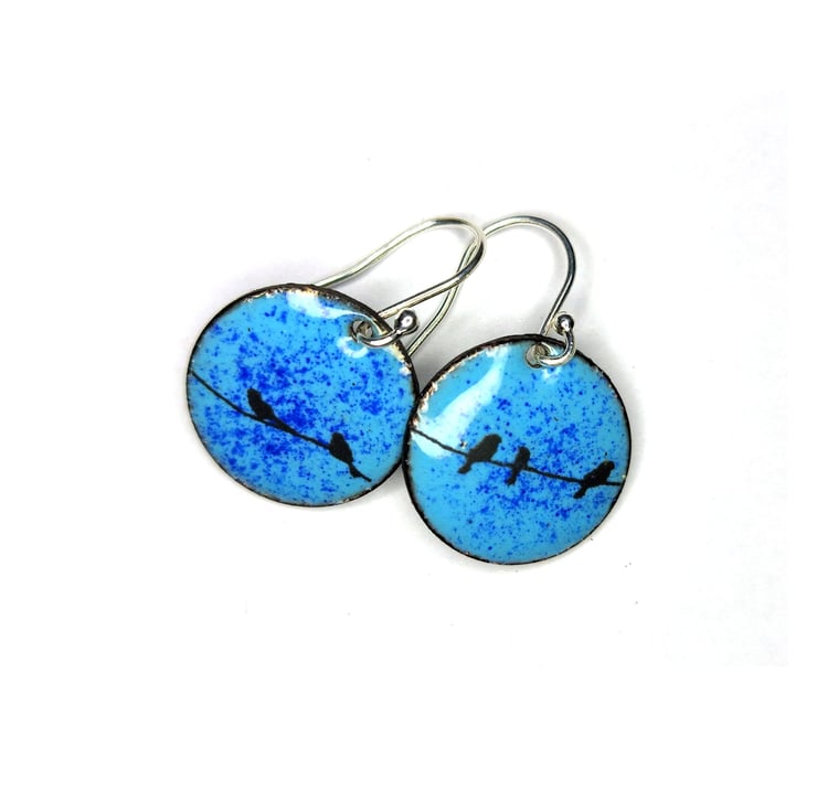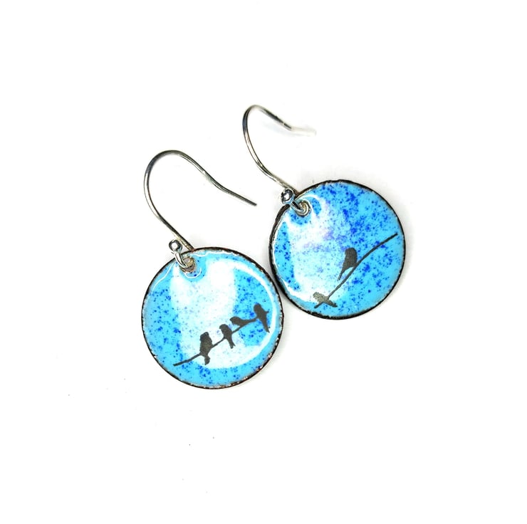 Blue enamel bird drop earrings - round