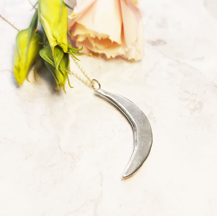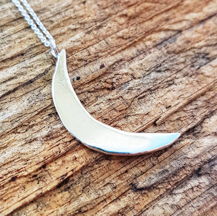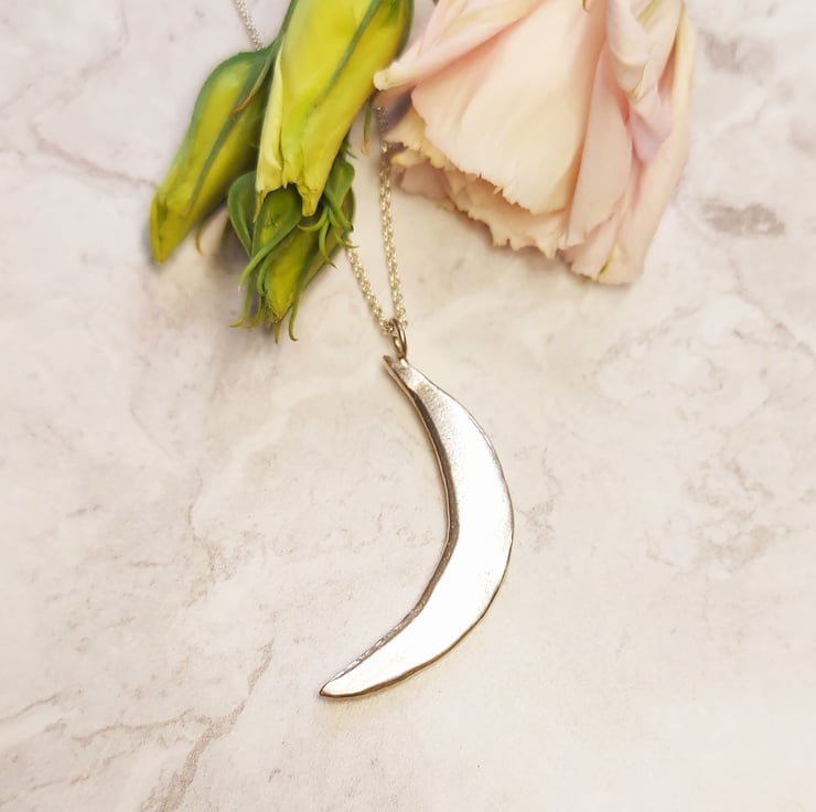 The moon measures approximately 35mm by 15mm and comes on an adjustable 16/18" (40/45cm) silver chain.