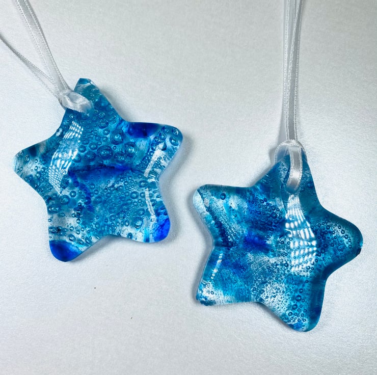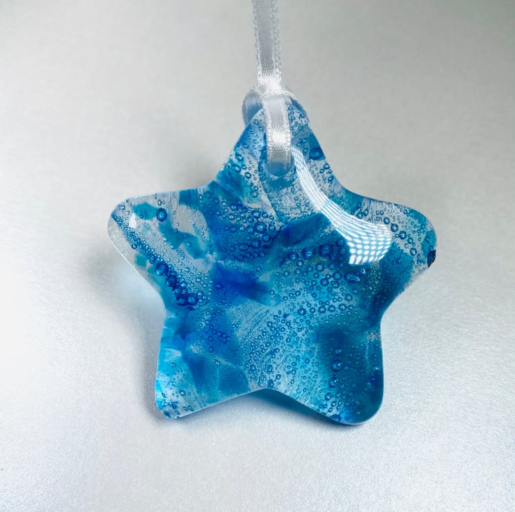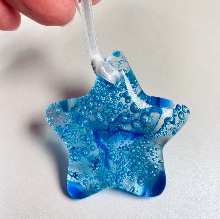 Do you know someone who’s been a star ? It could be they have graduated,passed exams, survived cancer, COVID or have just been a superstar in your life . A lovely thank you /thinking of you gift . Each cast glass heart is unique and handmade by me . These extra special stars are filled with tiny blue bubbles.