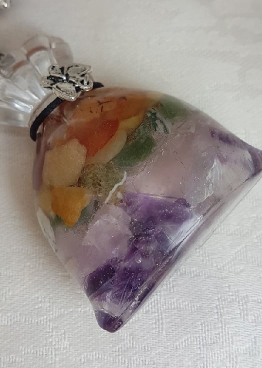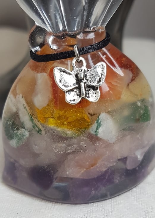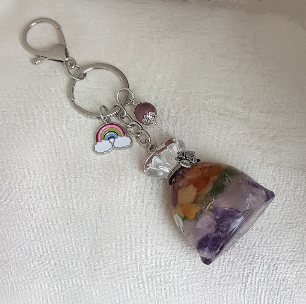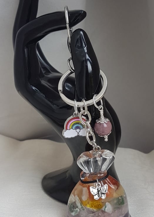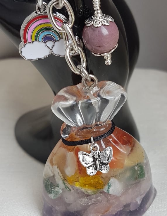 An unusual bag charm/key ring. A chunky and unique Lucky Bag shape is filled with Mixed Gemstone chips and resin. This fab key ring also has a Rainbow charm and beautiful Mookaite bead. There is also a small Butterfly charm around the top of the bag shape. An unusual and unique gift to keep your keys on or hang on your bag. This is quite chunky and because its filled with Mixed Gemstone chips its quite weighty.