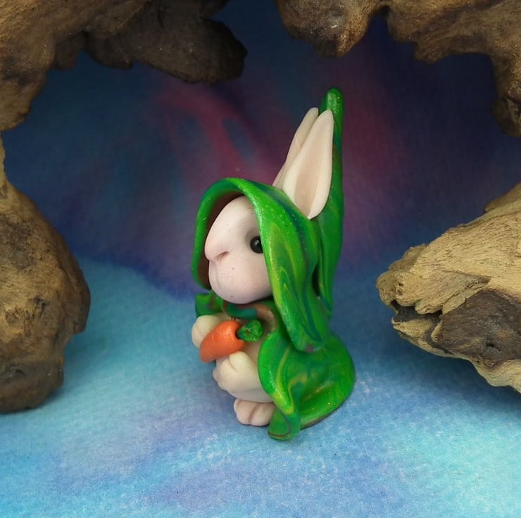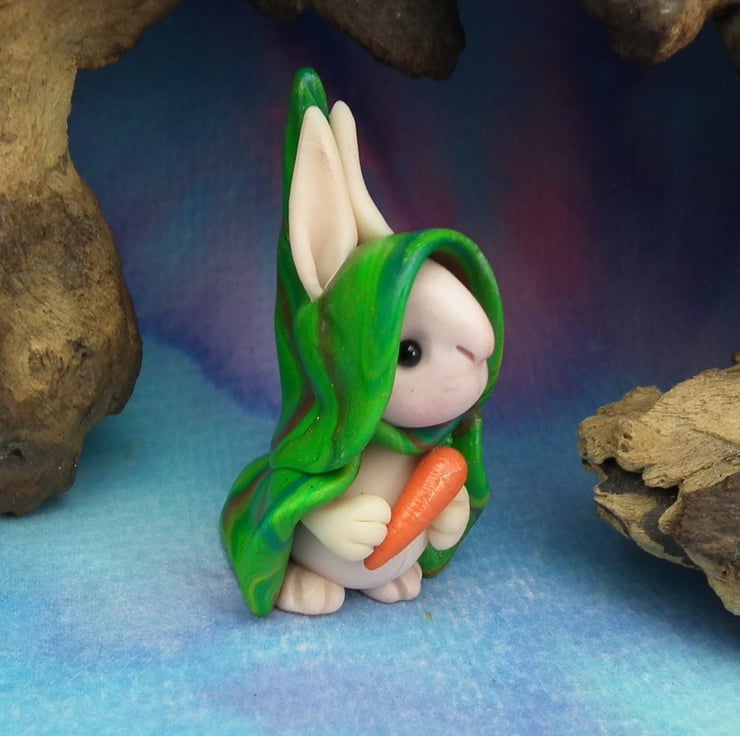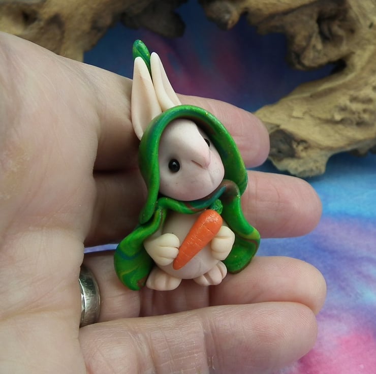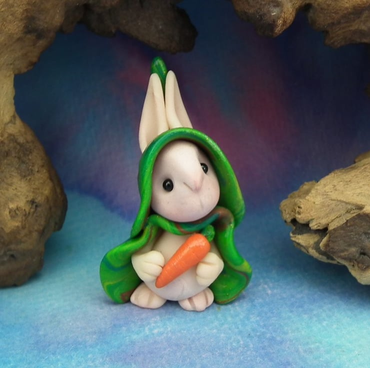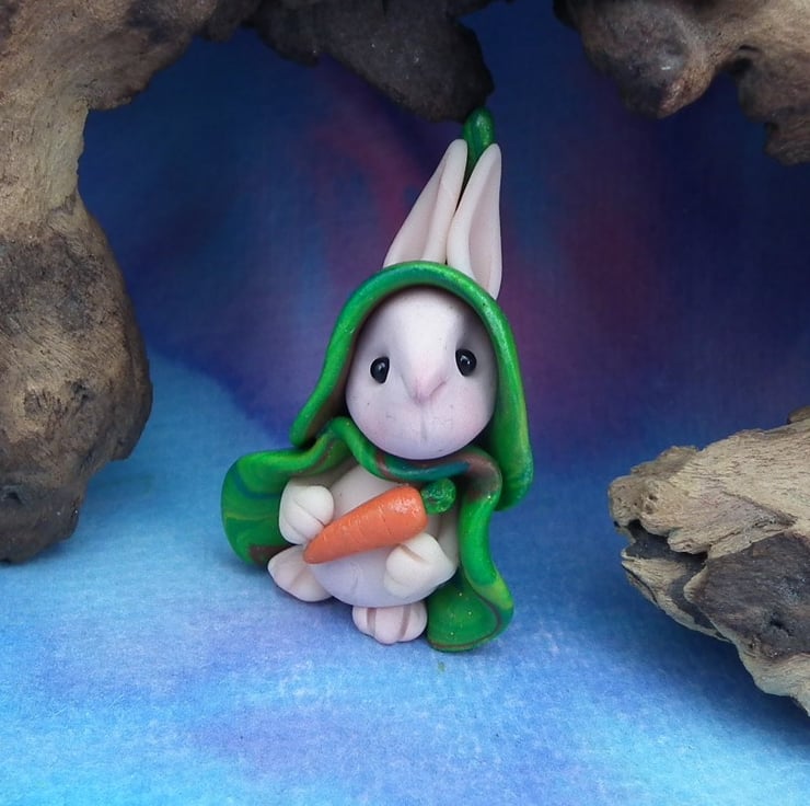 This is a 'one of a kind' creation; entirely handmade without the use of moulds here at my studio on the Sussex Coast. Modelled with Prosculpt polymers, painted with heat set paints before sealing with lacquer, Connie has sparkling black onyx eyes and a delicious carrot. She is one and a half inches tall.