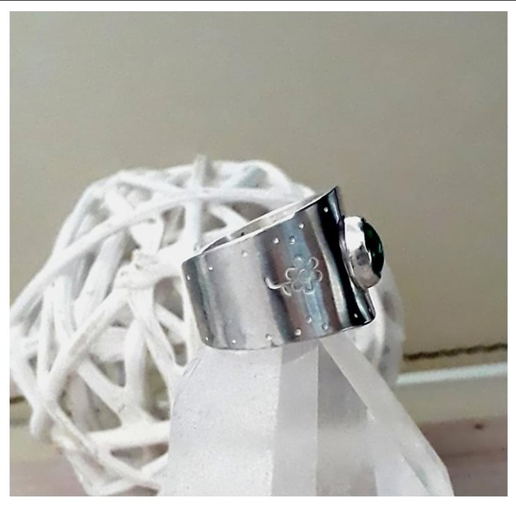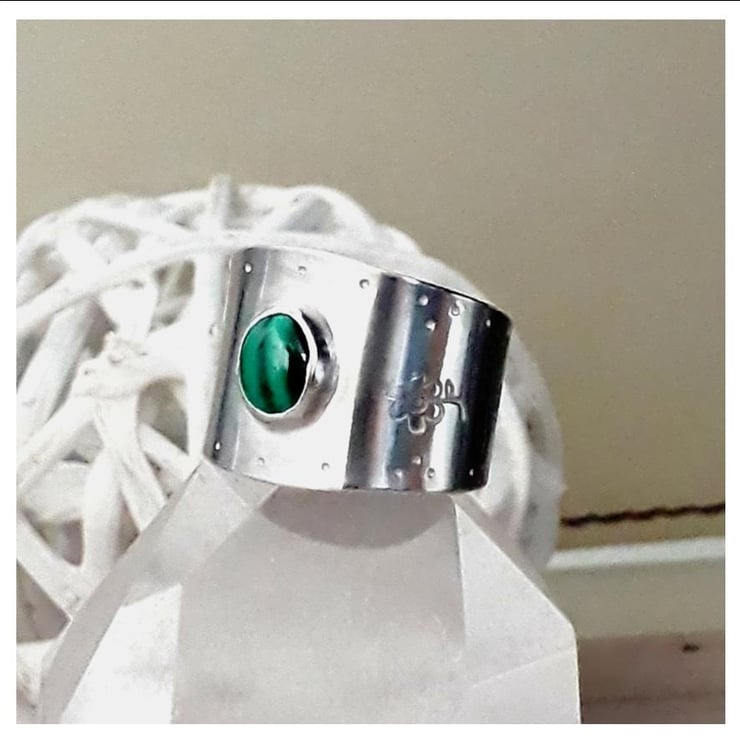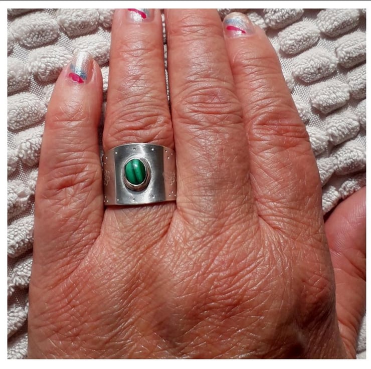 Handmade Solid Sterling Silver adjustable wide band ring set with an 8 x 6 mm oval Malachite Gemstone.