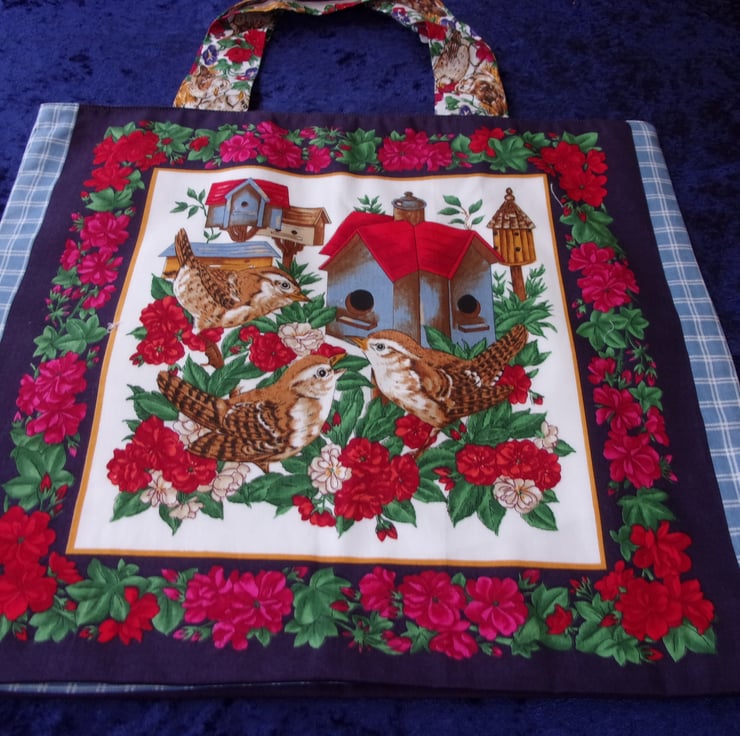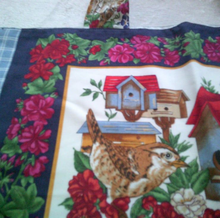 This Eco Friendly, fabric bag is made using 100% Cotton panels with pictures of Wrens and Bird Houses with Red flowers and green leaves. Both sides of the bag have the same picture.