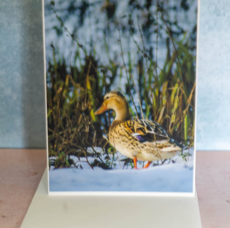 This card features a plucky duck who decided to go for a walk in the snow and who waddled right by me whilst I was taking photos of Blue Tits feeding a few meters away. Unlike myself, it seemed completely unfazed by the freezing conditions!