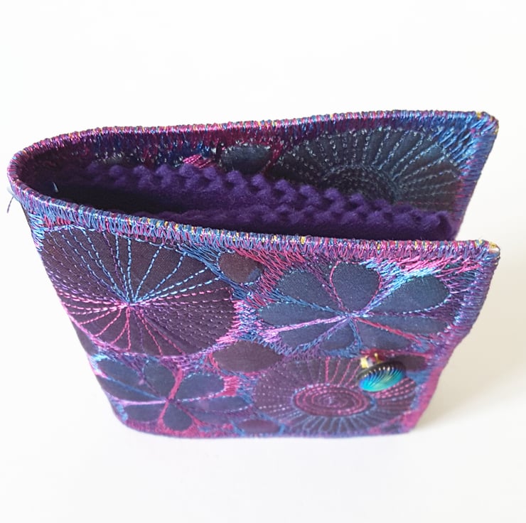 It has 4 leaves of purple felt for all your pins and needles and a beautiful button and an elasticated closure.
