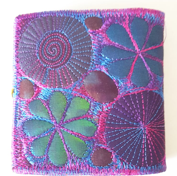 Made from layers of fabric including hand dyed Egyptian cotton and silk fabrics using the free machine embroidery style of sewing