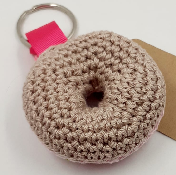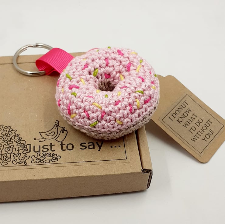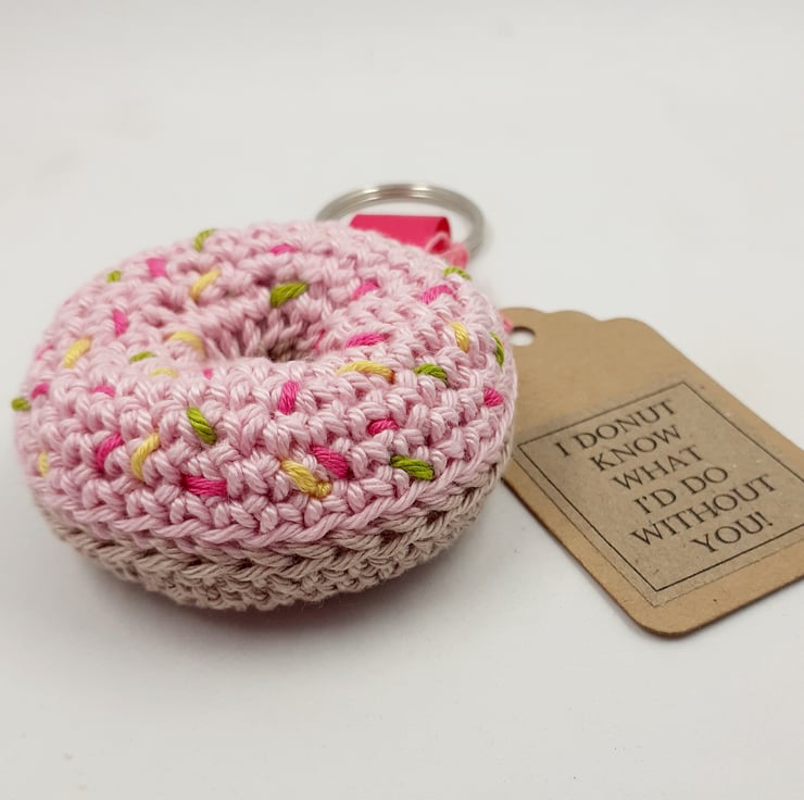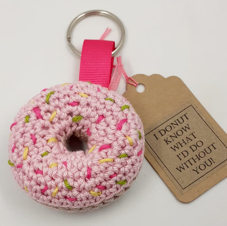 This plump and tasty looking iced donut is crocheted and embroidered in cotton and filled with polyester stuffing. It is firmly attached to a strong 3cm metal split ring with bright pink grosgrain ribbon. The donut measures approximately 6cm in diameter and the tag reads 'I donut what I'd do without you!' It would make a sweet card and keepsake gift in one, perfect for telling someone special how dear they are to you!