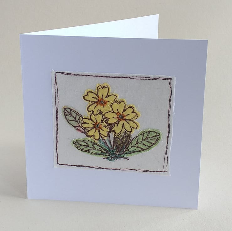This is a lovely spring-like card depicting primroses made using fabric scraps appliqued with freestyle machine embroidery. Each leaf and flower is hand cut before embroidering with different coloured threads.