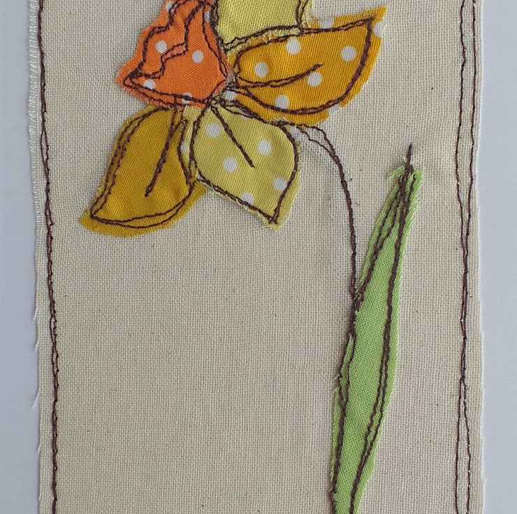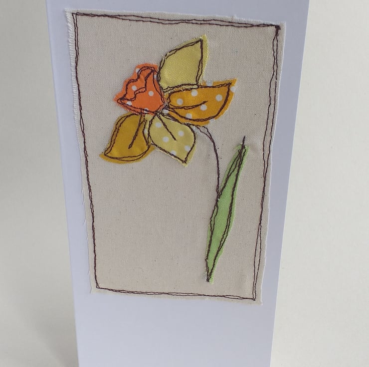 This bright and cheerful card depicts a daffodil made using fabric scraps appliqued with freestyle machine embroidery. Each petal and leaf is hand cut then stitched onto a plain fabric, which in turn is stitched onto the card.