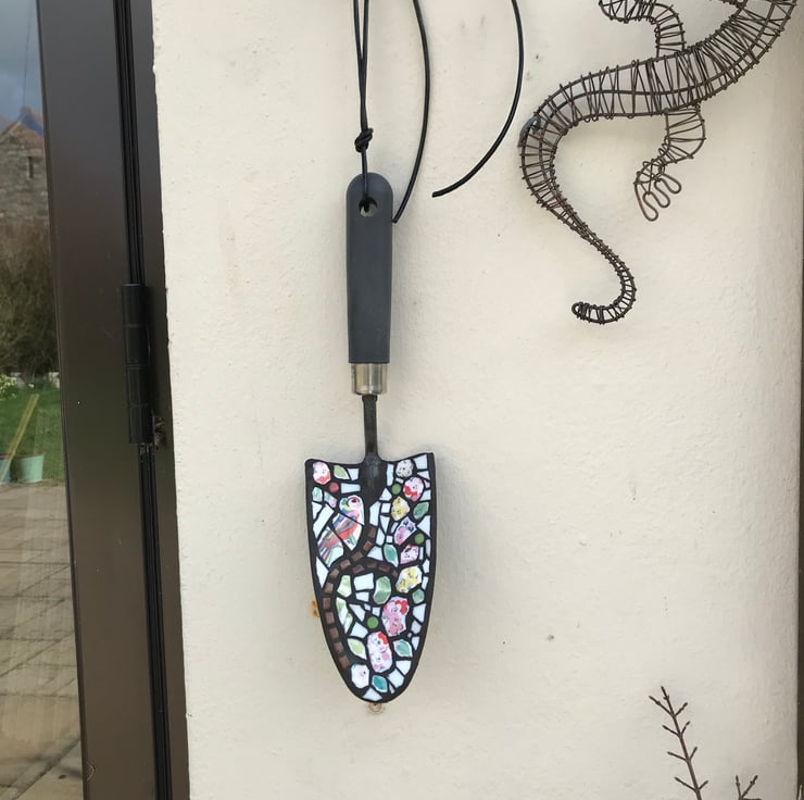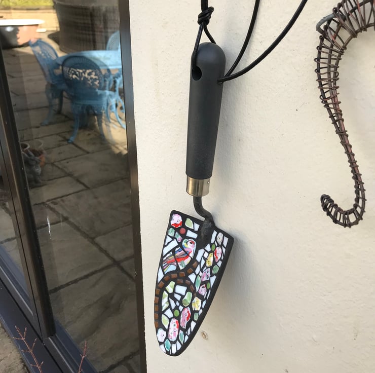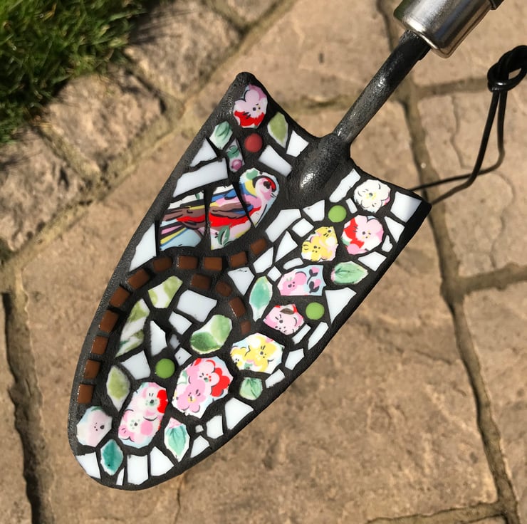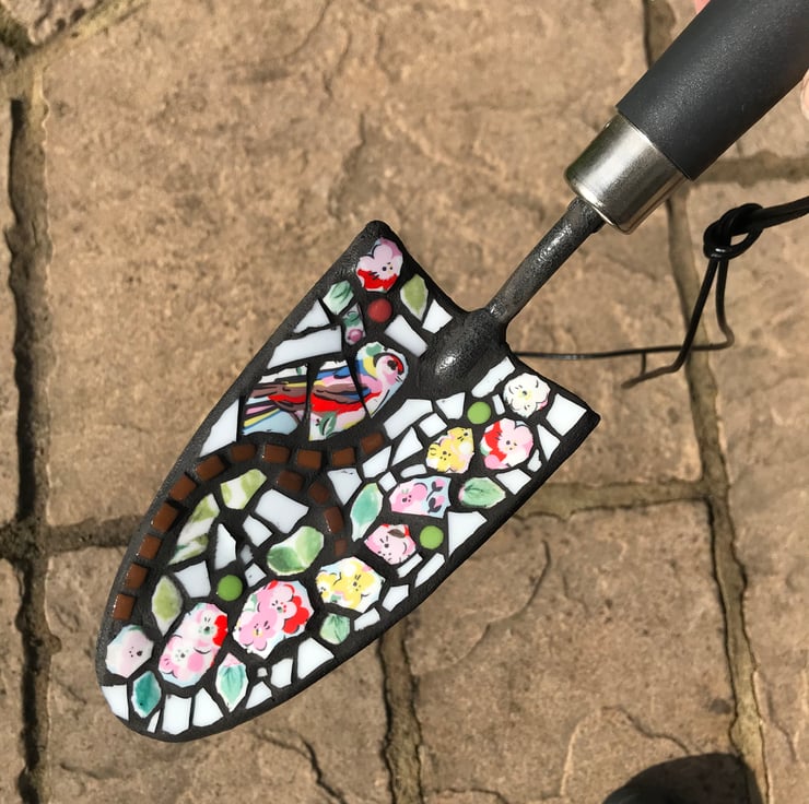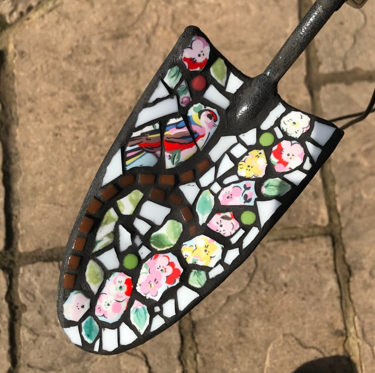 Hand cut pieces made from a broken Kath Kidston mug have been mosaiced onto a garden trowel making a very quaint garden ornament. The design is of a little bird sat on a branch.