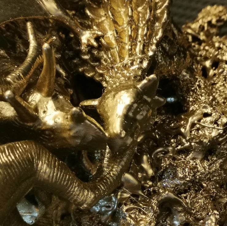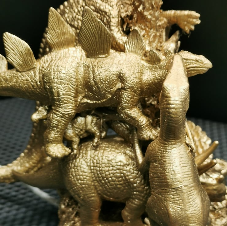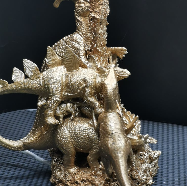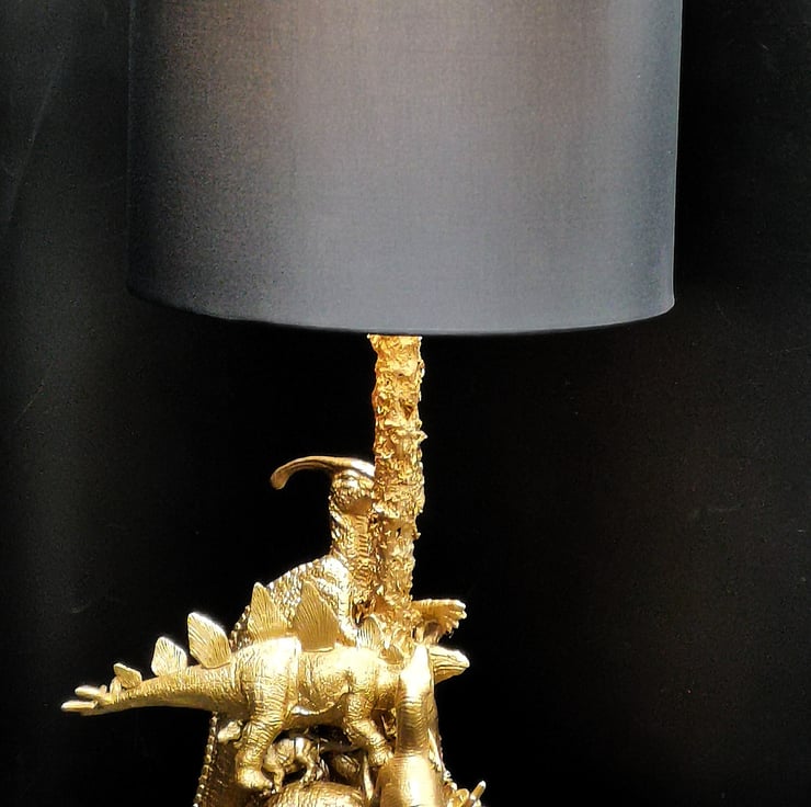 A beautifully stylish handcrafted black and gold dinosaur lamp. The lamp is new to meet safety standards but all of the dinosaurs and the materials are repurposed. I have sculpted the dinosaurs on the base and climbing up the stem. Both the base and stem have been textured, which adds contrast to the smooth black shade and compliments the diverse quality of the dinosaur skins.