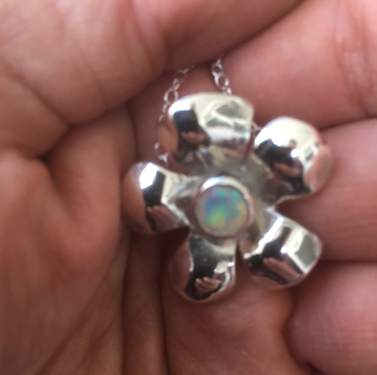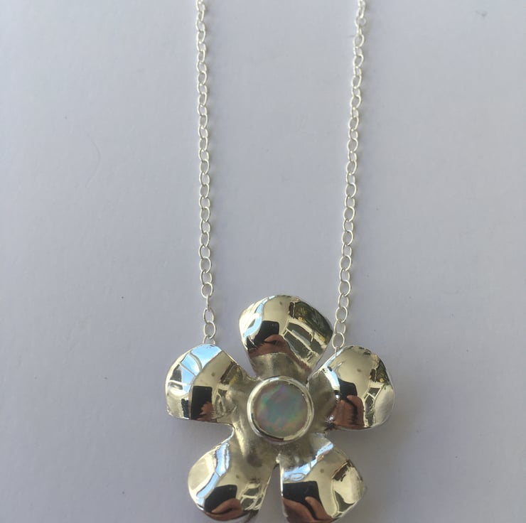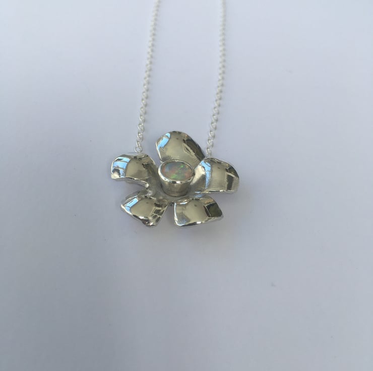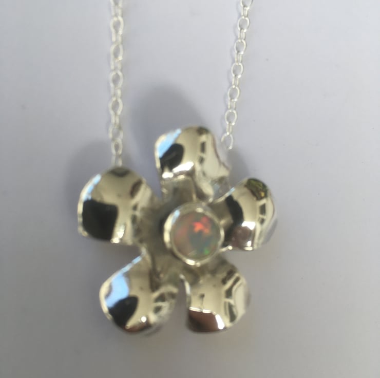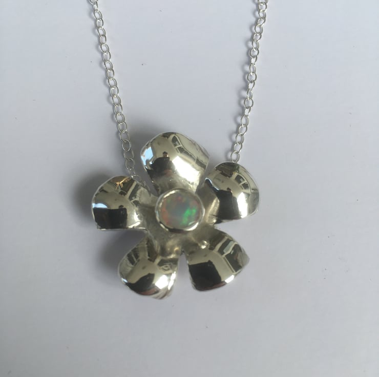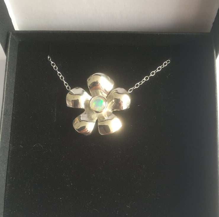 This striking pendant is set with a beautiful natural faceted Ethiopian Opal. It hangs beautifully and is a pleasure to wear . The blossom has been formed by hand using traditional methods ,all finishings and chain are Sterling silver.
