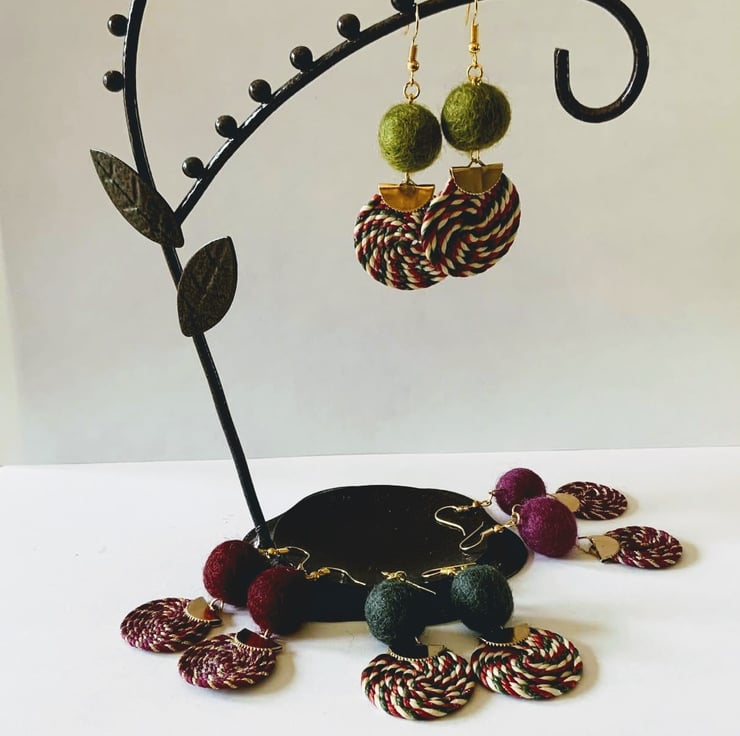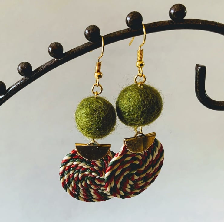Felted wool ball earrings with silk cord spirals in festive green cream and red.