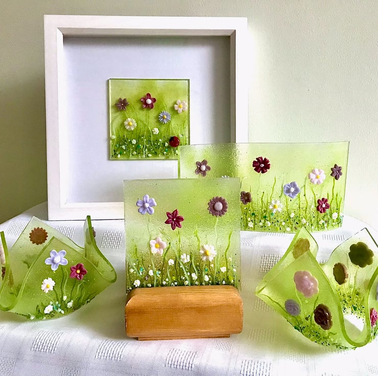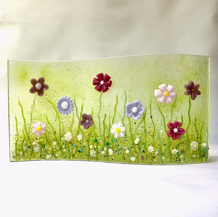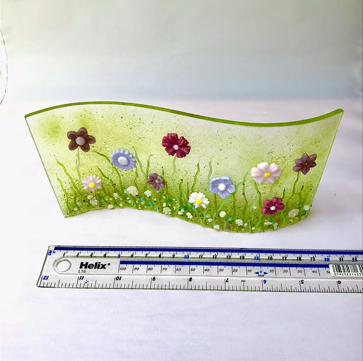 Capture the essence of a sun-drenched meadow in full bloom with this stunning handcrafted fused glass arch screen. Inspired by the vibrant colours and delicate textures of British wildflowers, this unique piece of glass art brings the beauty of nature into your home all year round.