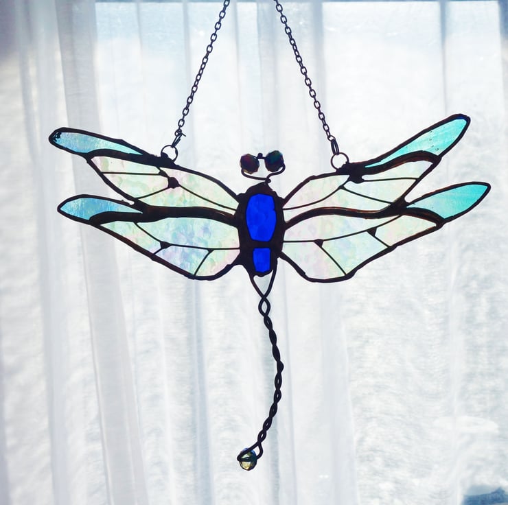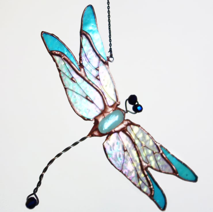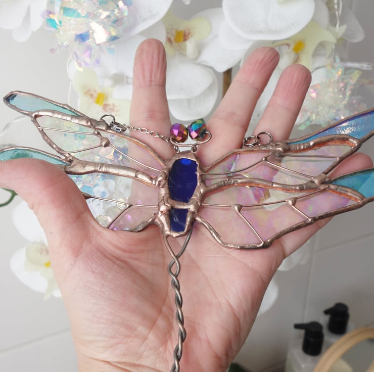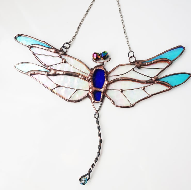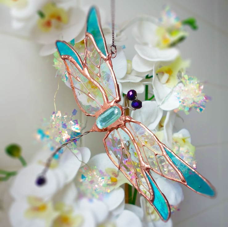 A beautiful, ethereal dragonfly with gossamer rainbow stained glass wings, delicate copper wire veins, a glass crystal body and faceted bead head and tail. The wings are tipped with the palest iridescent blue.