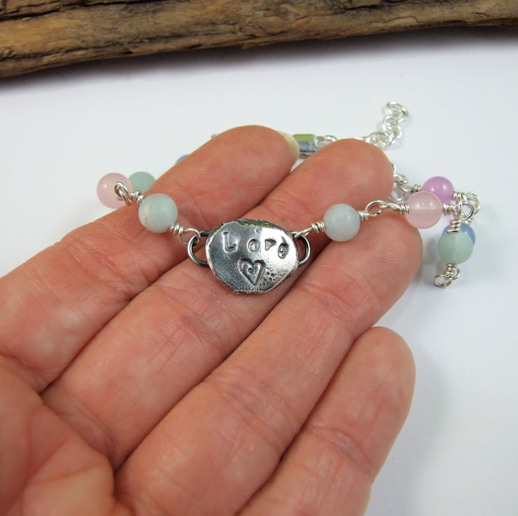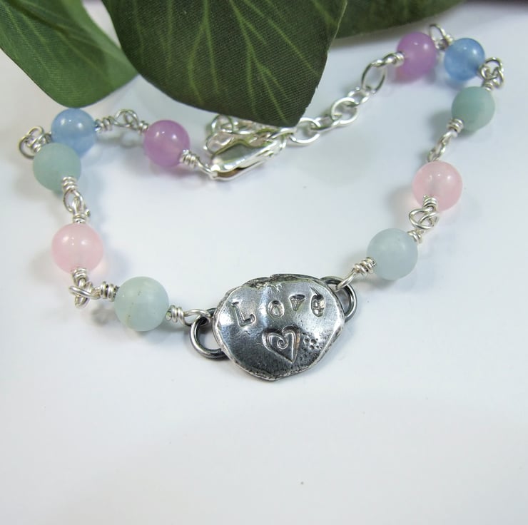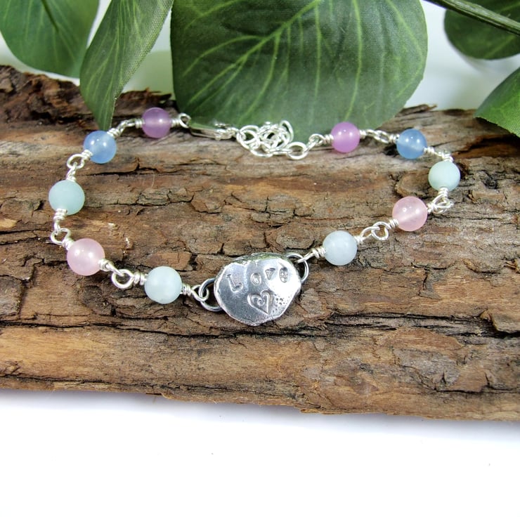 I have made the bracelet from a mixture of 6mm gemstone beads of Aquamarine, Dyed Jade and Amazonite and Rose Quartz. The silver nugget centre is handcrafted from sterling silver, heated to melting point and then flattened. To this I have hand stamped the word Love and a little heart below. The gemstones and fittings have all been wired securely together with wrapped wire loops and added a lobster clasp closure with a length of chain.