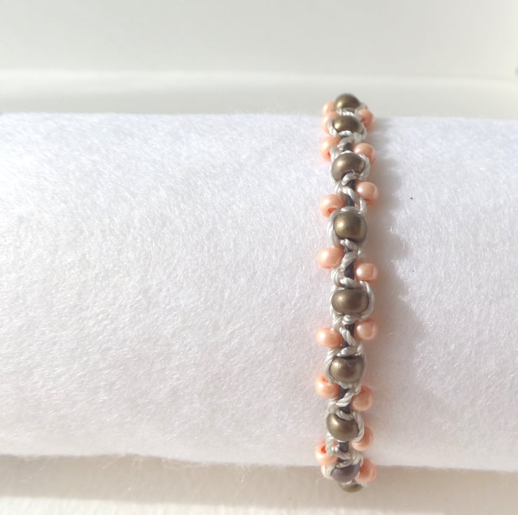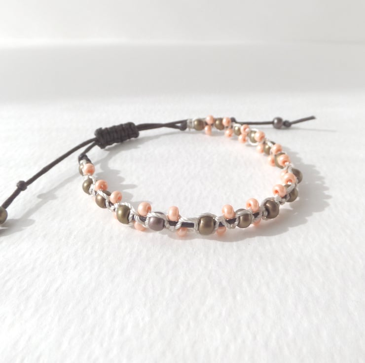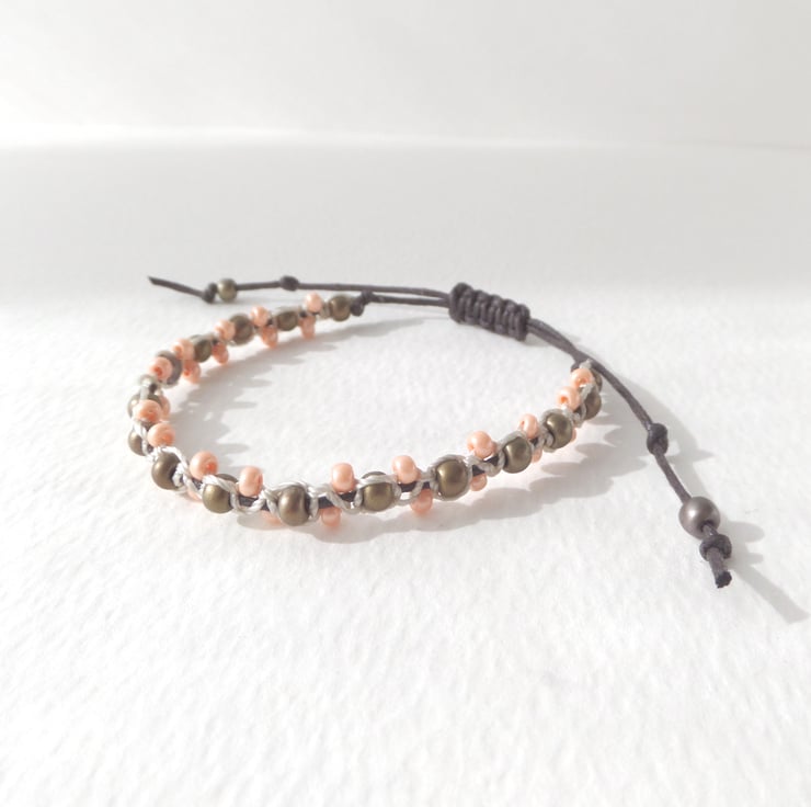 A boho chic, adjustable casual olive/khaki and peach beaded macramé Shamballa, brown cotton cord bracelet.