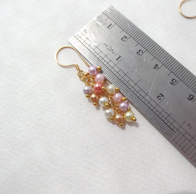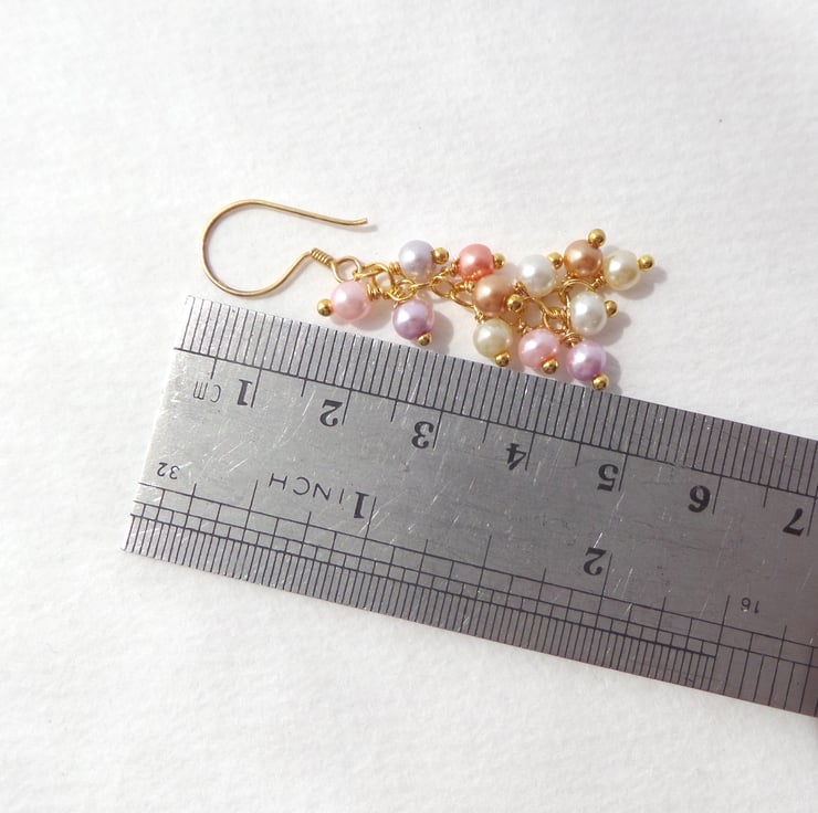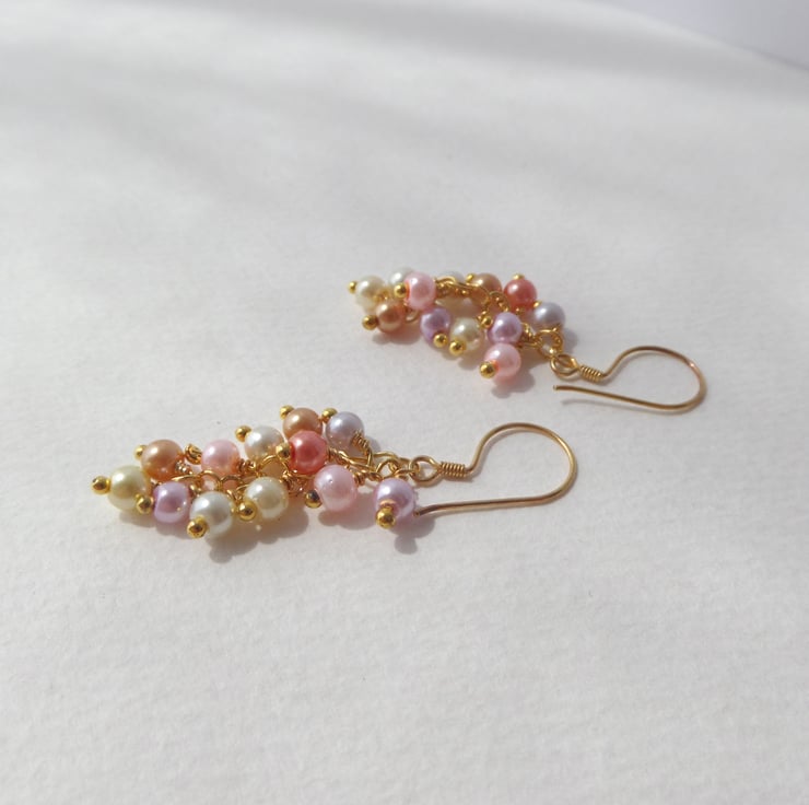 A pretty lush array of mainly pastel coloured, small glass pearls carefully chosen for colour, all securely wire wrapped into each other to form a chain, creating cascade or cluster earrings.