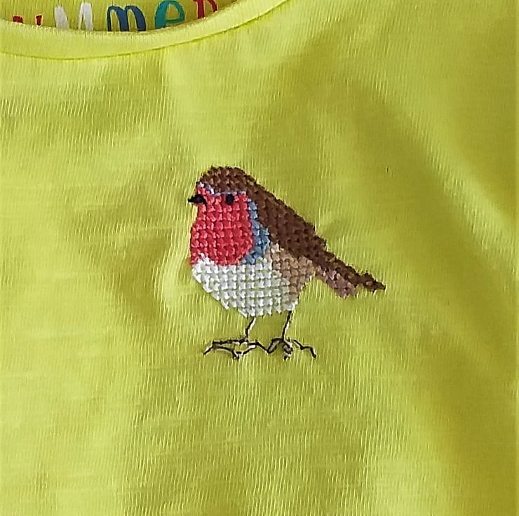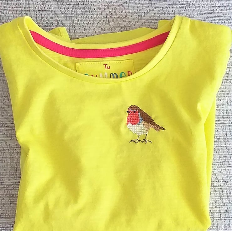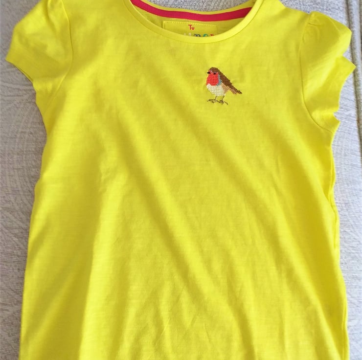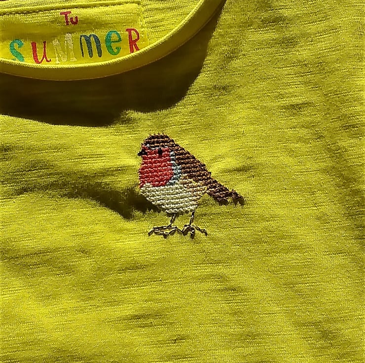 I have designed and hand-stitched a cheeky little robin on the front of this pretty lemon yellow shirt by Tu. As I never use a permanent backing material when hand-embroidering kids' clothing, there is nothing inside to irritate your child's skin. The shirt is all cotton, has short sleeves slightly gathered at the shoulder and is machine washable.