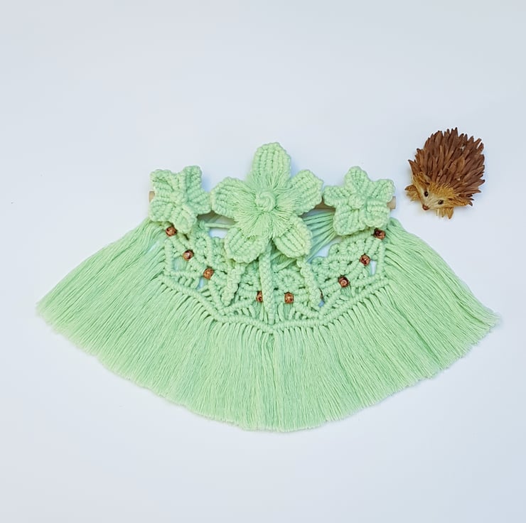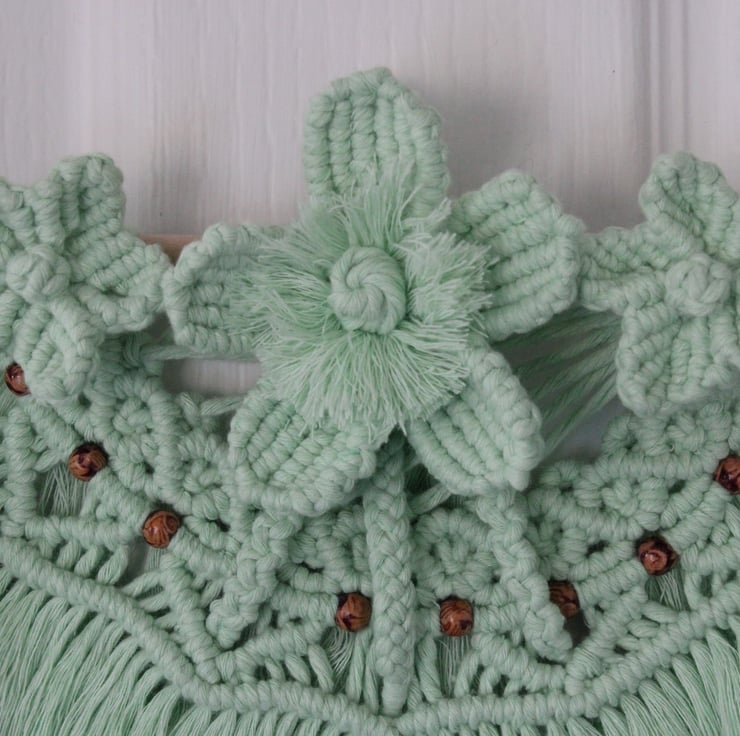 A gorgeous little wall hanging full of summer promise. 3 flowers adorn the top of the piece and a string of daisy chain curves round underneath. Below the daisies little decorative wooden beads intersperse the design and this is followed by a full brushed out skirt of cords.