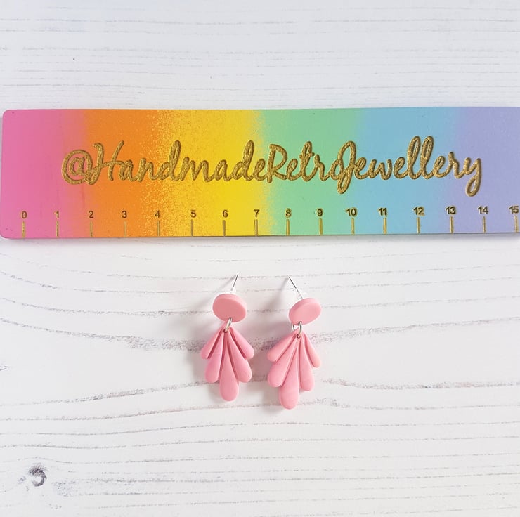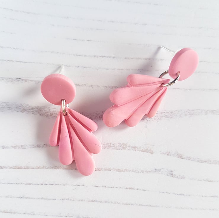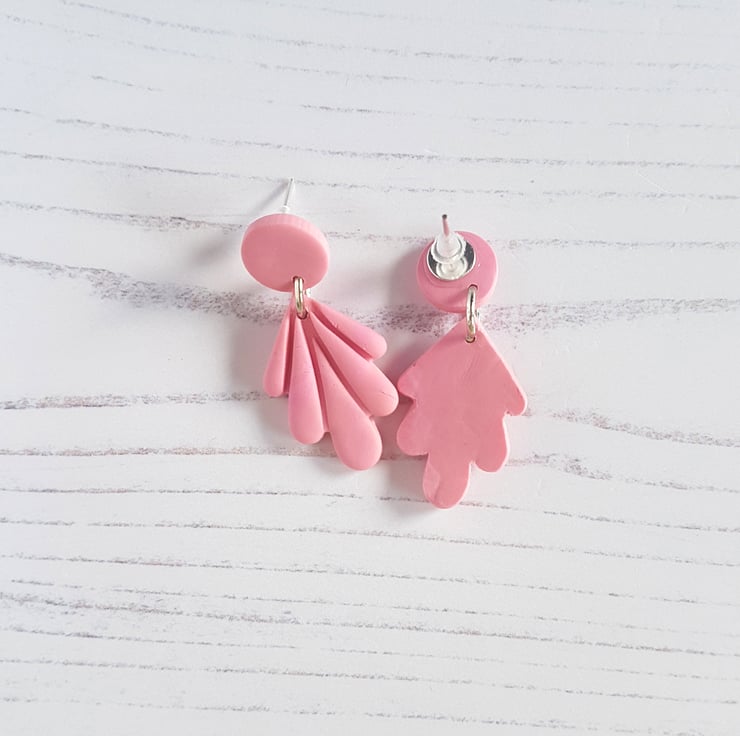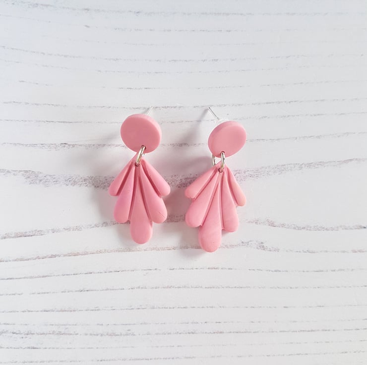 These gorgeous scallop shaped earrings have been carefully hand crafted using a pink mix polymer clay. A second circle piece with the same pattern and effect is joined onto the scallop with a silver plated jump hoop, creating a dangle effect. The earrings are then fixed onto a silver plated stud earring post back, with rubber backs to secure when wearing.
