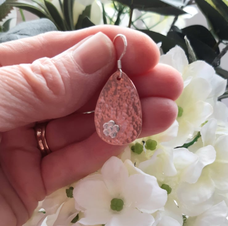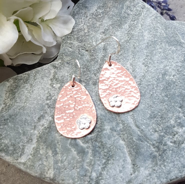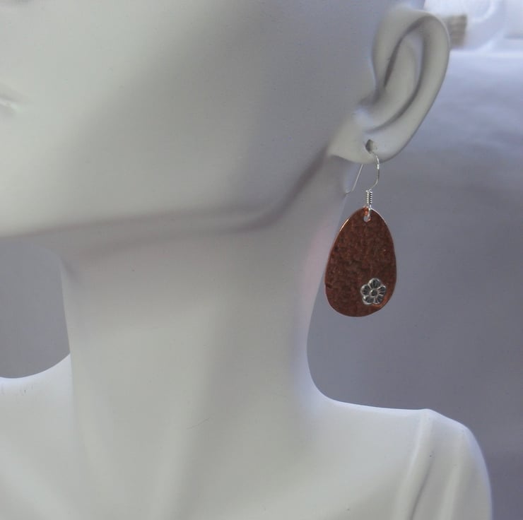 These Earrings have been cut from a sheet of copper with a sterling silver flower being soldered on each copper piece. The copper has then been hammered to give texture and polished to a lovely shine. They are then attached to sterling silver ear wires