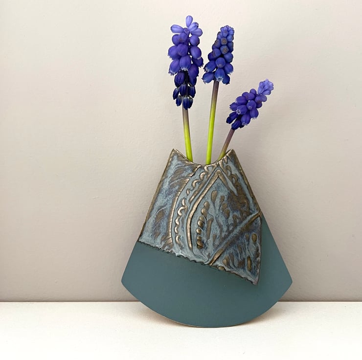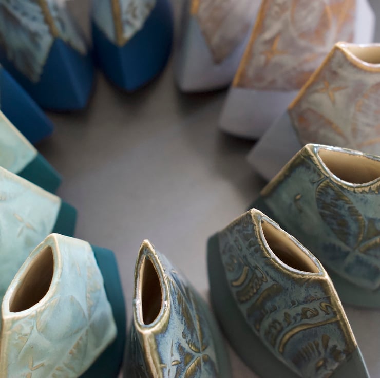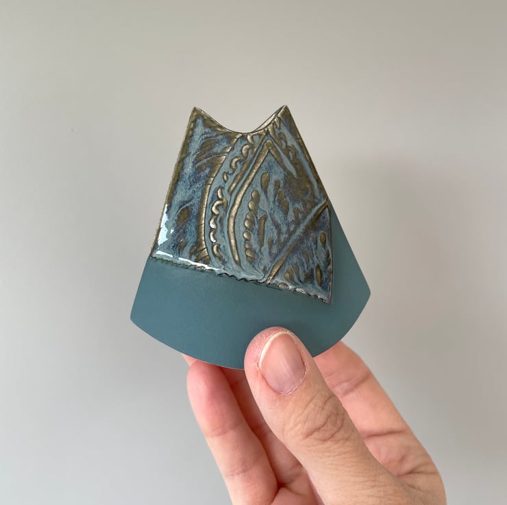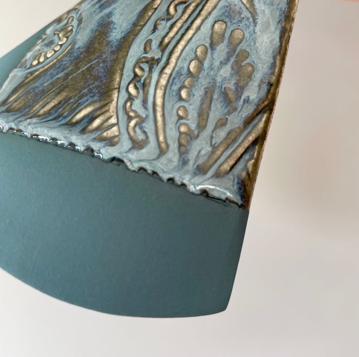 Formed from thin slabs of clay, imprinted with pattern. Once the piece is dry, it is fired first to 1000 degrees C. Separate layers of underglaze and glaze are then painted on before it is fired for the second time, to 1200 degrees C, making it strong and durable. Vases are coated inside with a clear gloss glaze. All underglazes and glazes are lead-free and non-toxic.