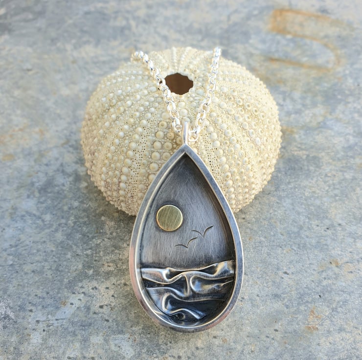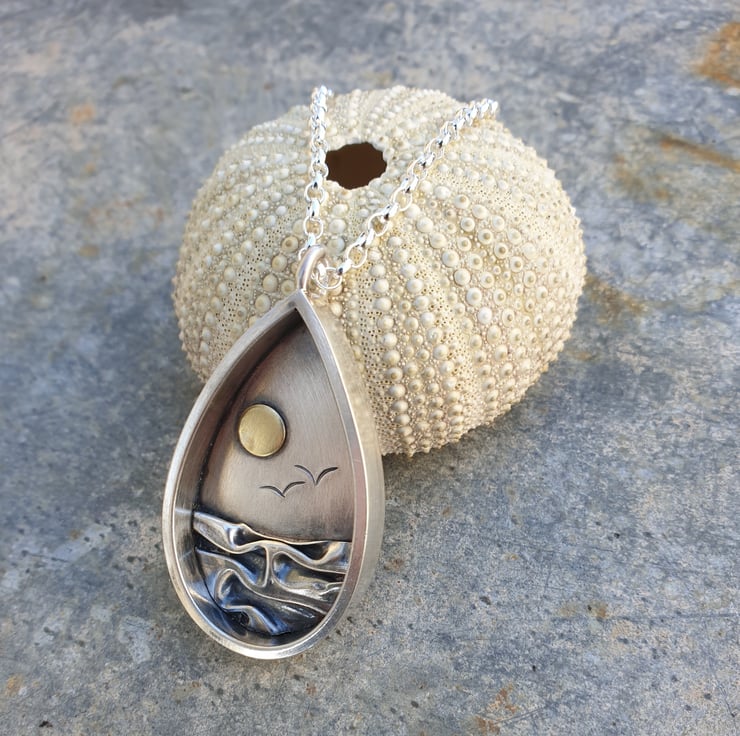 This statement piece is handmade in sterling silver to create a three dimensional beach scene with sea, brass sun and seagulls. It measures approx 41mm x 25mm and comes complete with a sterling silver belcher chain which fastens with a lobster clasp.