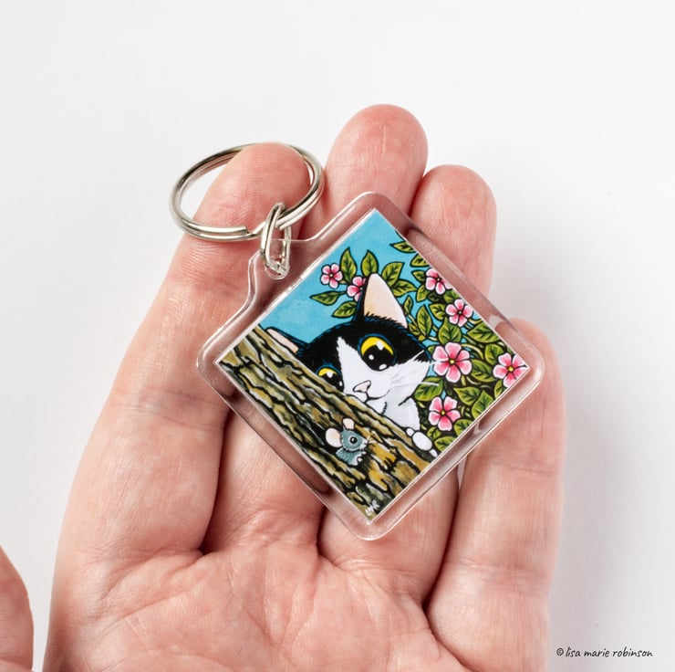 Tuxedo Cat & Mouse keyring featuring art by Lisa Marie Robinson.